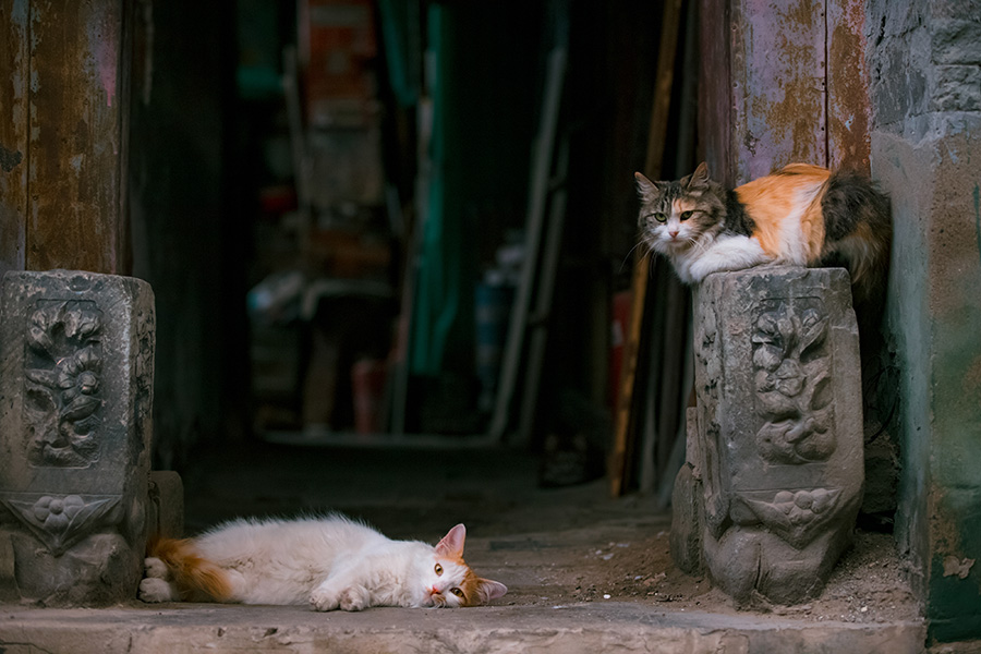 Aprovecharemos para decir que hace ya muchos siglos que los gatos son “protectores oficiales” de la Ciudad Prohibida. Durante la dinastía Ming (1368-1644) se creó una oficina dedicada al registro y cuidado de los gatos residentes en el palacio imperial. En la dinastía Qing (1644-1911), esto se amplió para incluir el nombre y origen de cada gato. Es muy probable que los modelos de Wu Hongli sean descendientes de estos primeros ocupantes. Actualmente, el personal de la Ciudad se ocupa de su alimentación y cuidado.