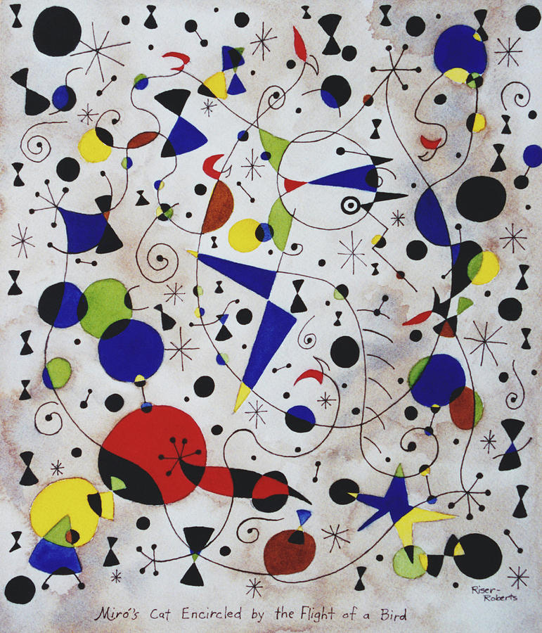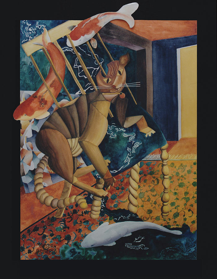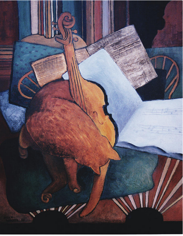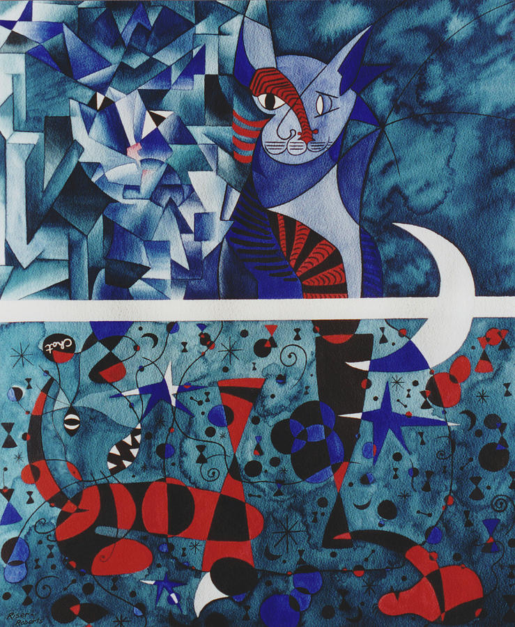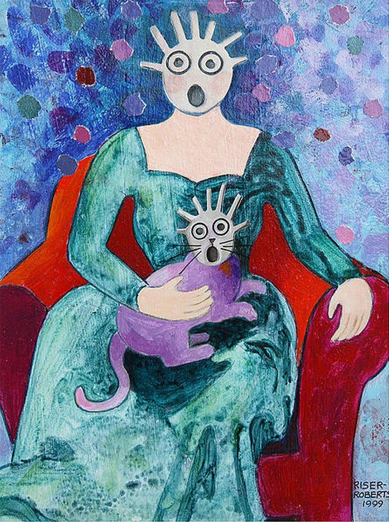 Cuando descubrimos el cuadro de un gato azul sentado en una silla que nos recordó vagamente al pintor Amadeo Modigliani, que nunca pintó un solo gato, nos enteramos de que la autora, Eve Riser-Roberts, había realizado una serie de cuadros imitando el estilo o el cuadro de pintores famosos sustituyendo a un personaje por un gato o sencillamente añadiendo uno.