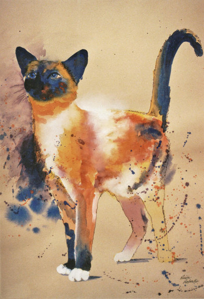 Tituló la serie “Famous Artists’ Cats” (Los gatos de artistas famosos). Según la pintora, la idea nació cuando una amiga suya le pidió que hiciera un retrato a su gato siamés y, al ver una foto de él recostado contra un cojín, le vino inmediatamente a la mente el conocido cuadro “Olympia”, de Edouard Manet. Por las fechas que hemos podido encontrar, debió empezar la serie alrededor de 2009 y ganó el Primer Premio en un concurso organizado por el Carnegie Art Museum de Oxnard, California.