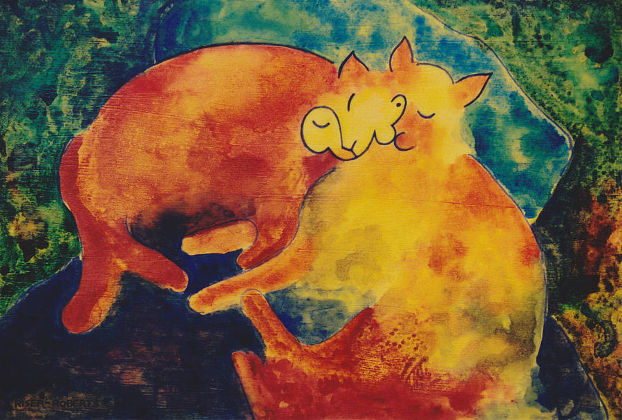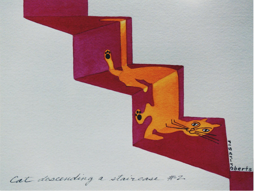 Eve Riser-Roberts es una entusiasta de los gatos, de eso no cabe duda, aparecen en numerosos cuadros suyos, no solo en la serie en que acompaña cada cuadro con una frase explicando por qué hay un gato en lugar de la persona. Por ejemplo, en el cuadro con los girasoles de Van Gogh, imaginó que el pintor salió un momento y su gato saltó a la mesa para jugar con las flores. Por cierto, Van Gogh tampoco incluyó nunca un gato en sus lienzos.