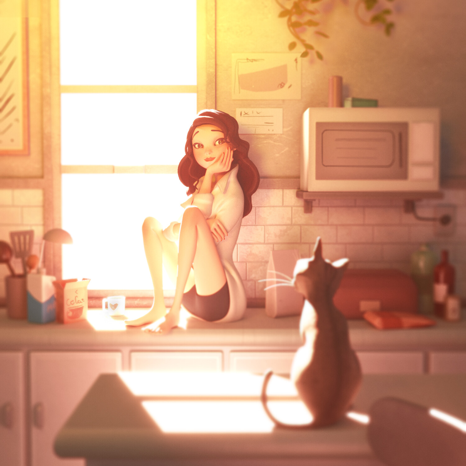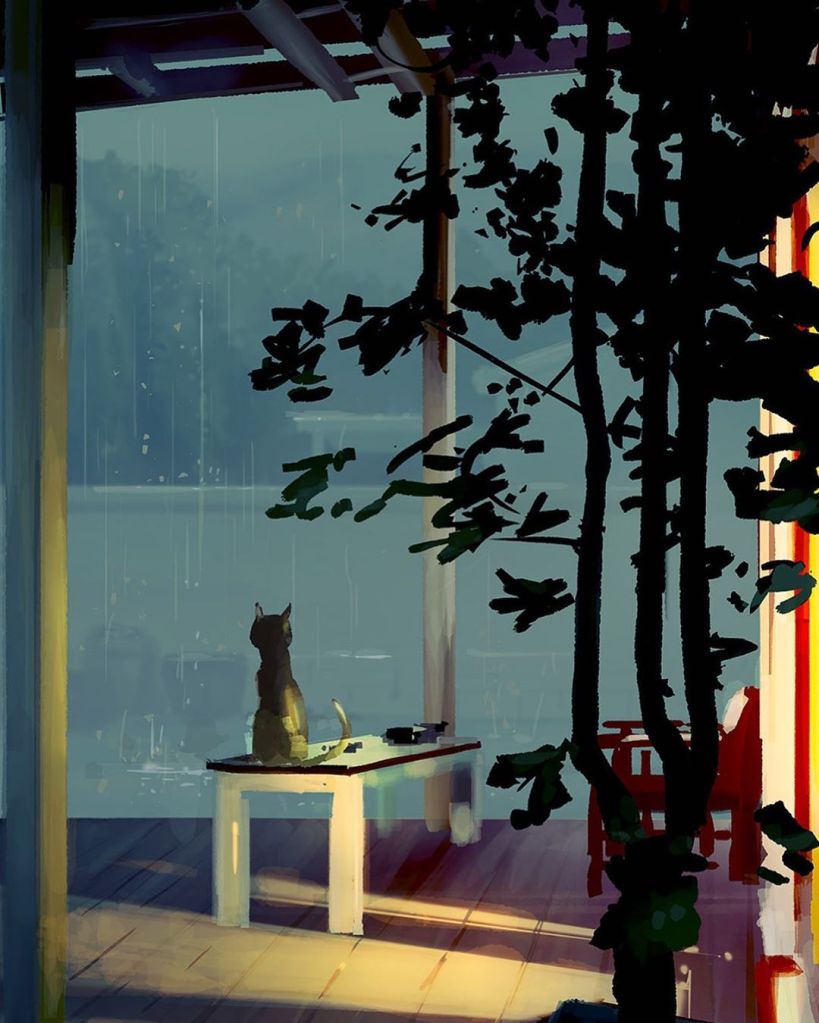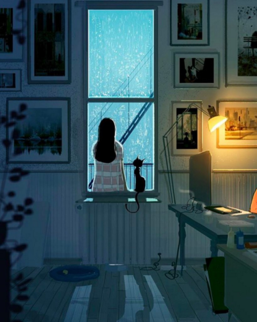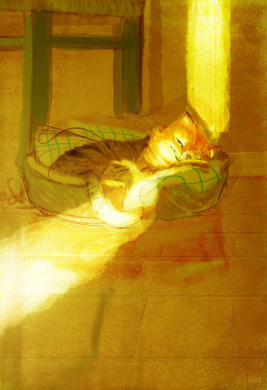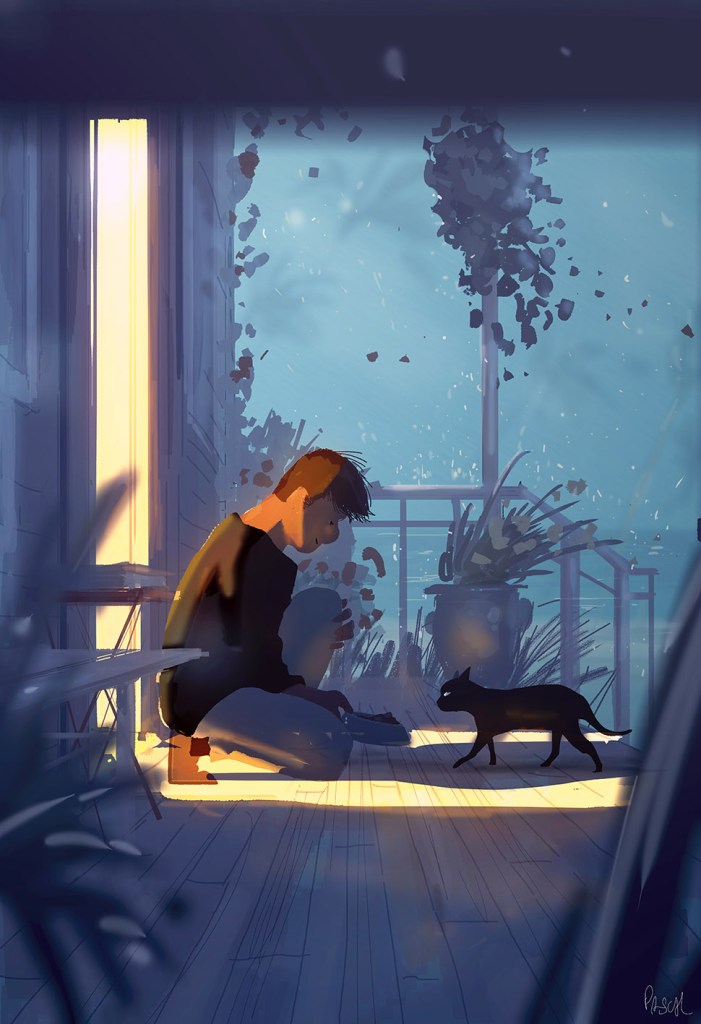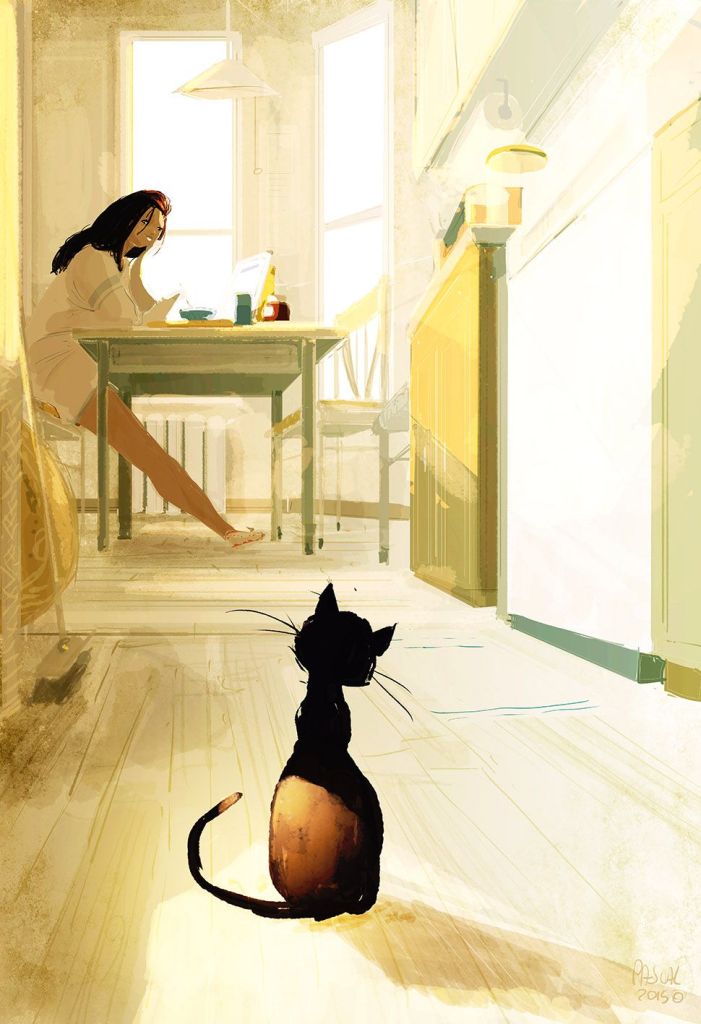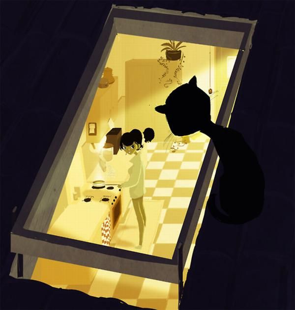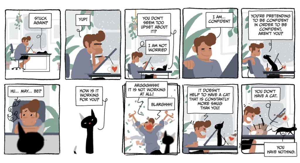 También está el dibujante sin inspiración (De noche tarde). Gato: ¿Atascado de nuevo? Hombre: Sí. Gato: No pareces muy preocupado. Hombre: No lo estoy. Me siento seguro de mí mismo. Gato: Finges estar seguro para sentirte seguro, ¿verdad? Hombre: Bueno… puede ser. Gato: ¿Y qué tal te va? Hombre: No funciona para nada (grito de desesperación) Y no ayuda tener a un gato presuntuoso a mi lado. Gato: No tienes a un gato, no tienes nada.