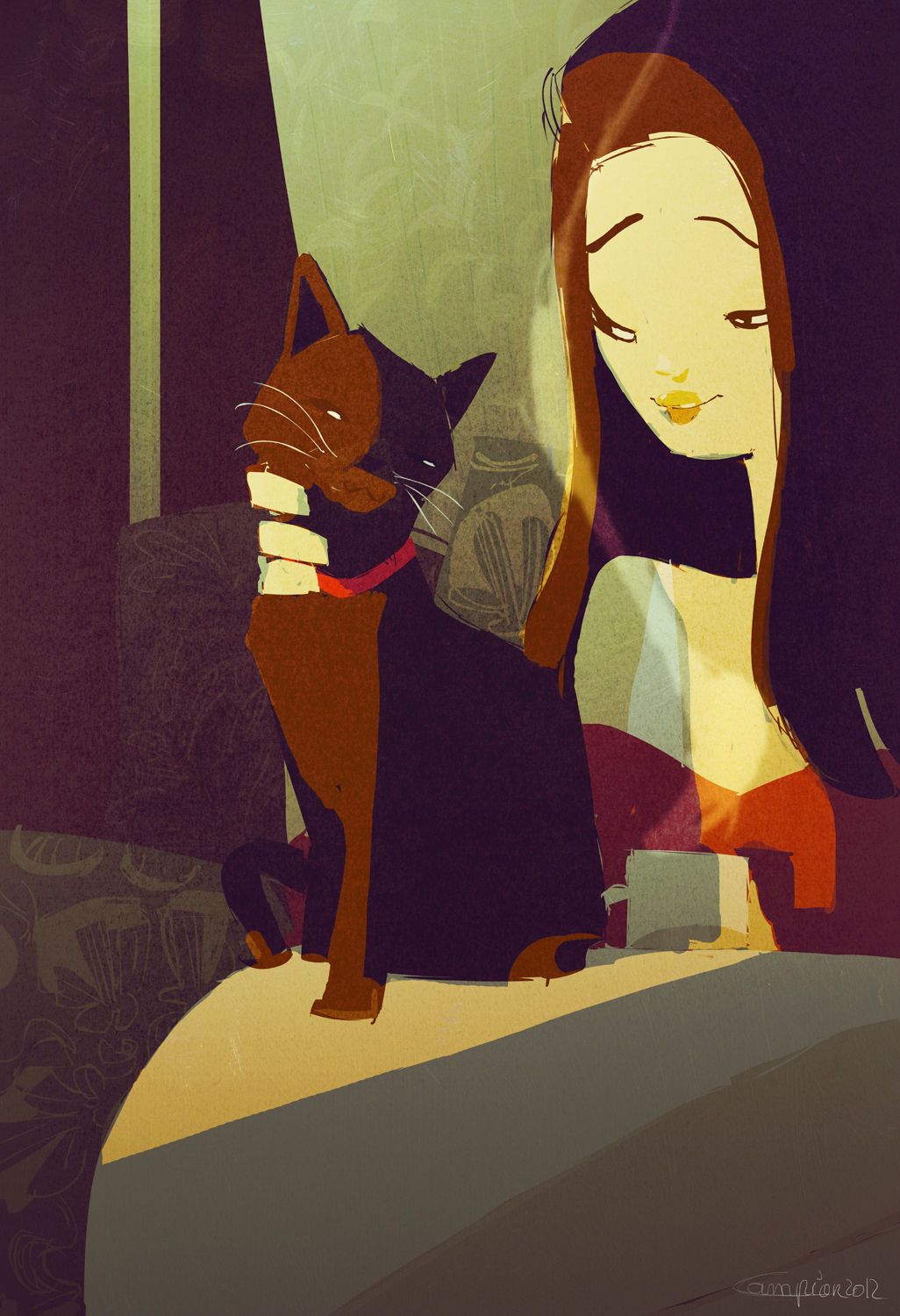 No sabemos cuándo apareció el gato de los dibujos que hemos escogido para ilustrar esta entrada. En la mayoría se ve a una mujer acompañada de un gato negro en escenas sumamente cotidianas. En contadísimos casos, el gato está con un hombre o a una pareja.