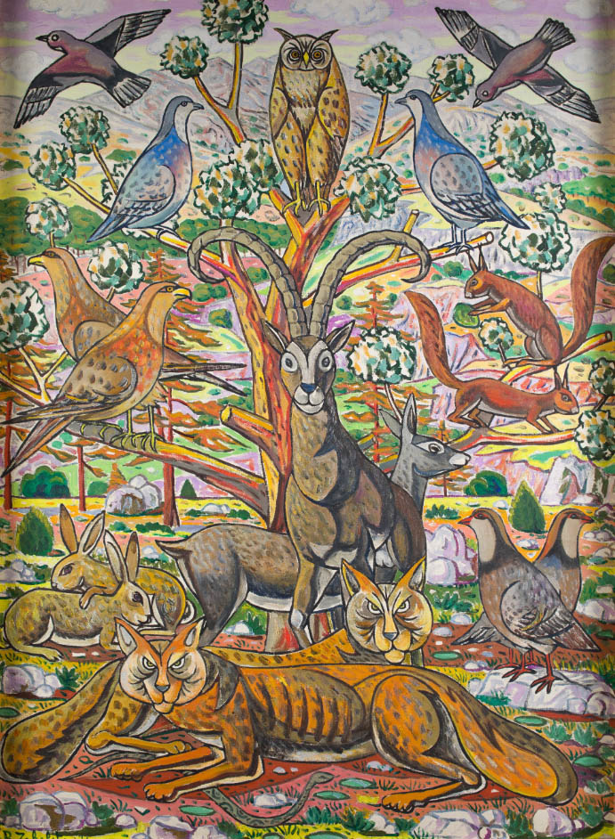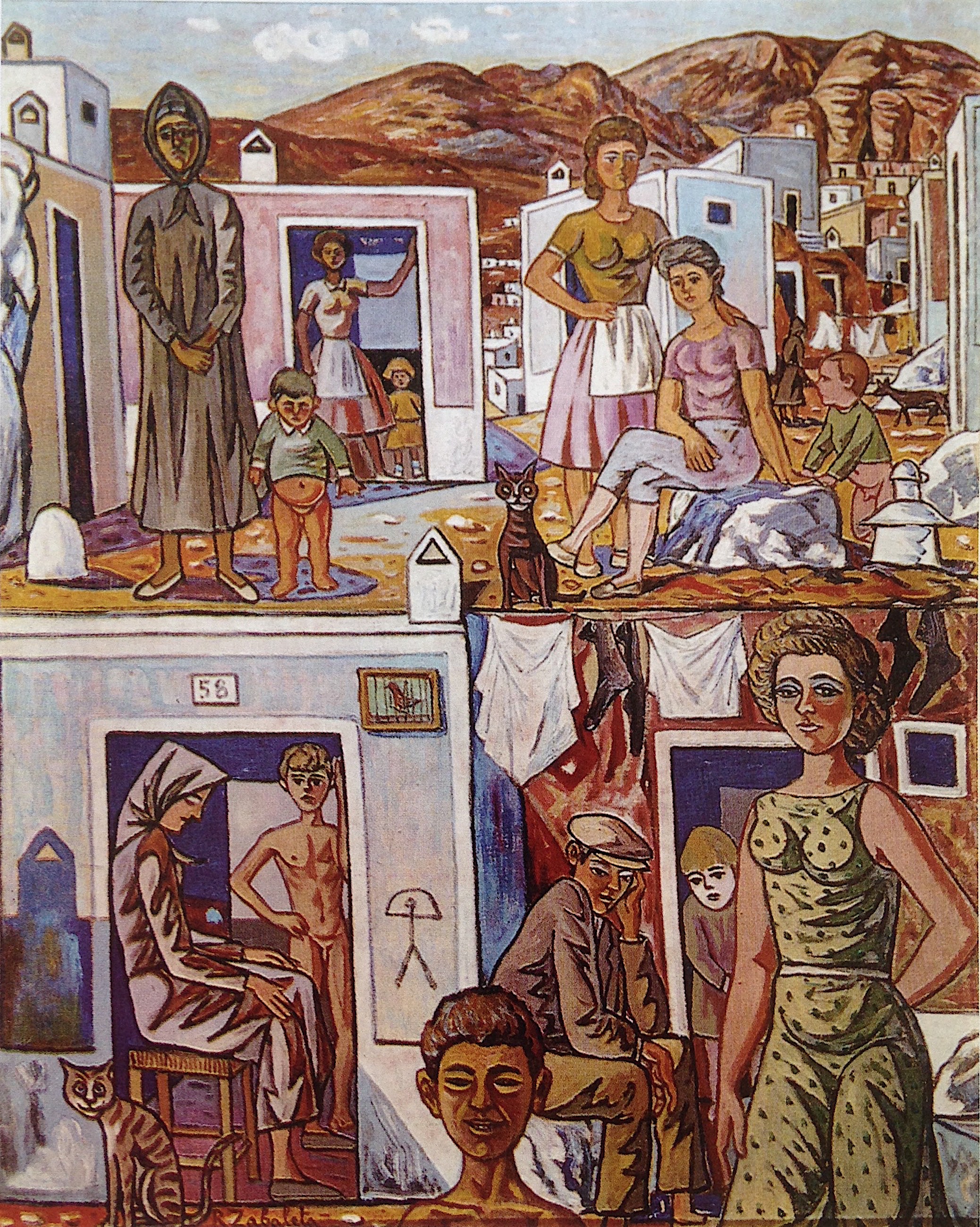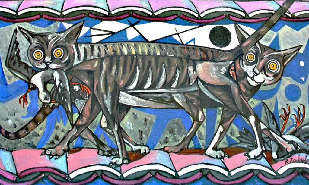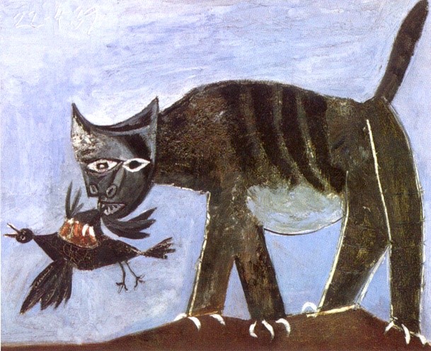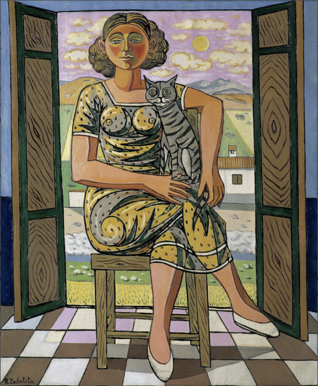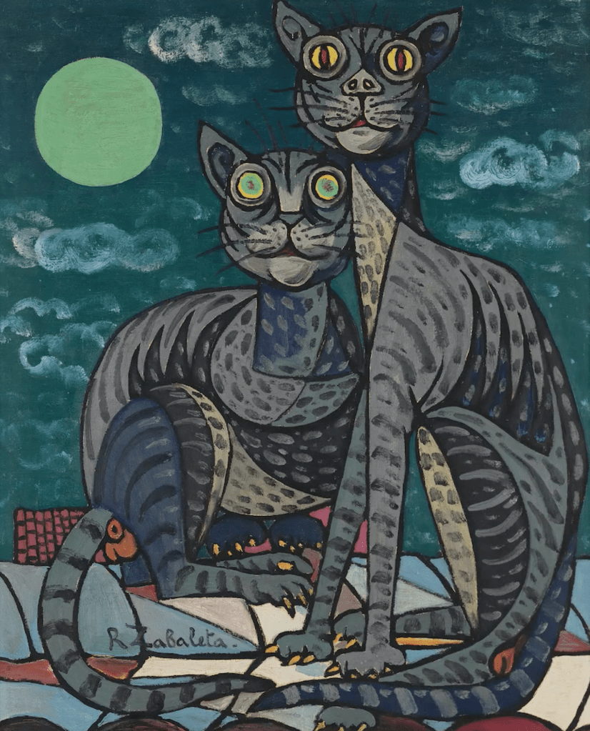 Rafael Zabaleta quizá sea más conocido por sus coloridos cuadros de escenas campesinas, pero incluso muchos estos se veían invadidos por un toque surrealista. Produjo una gran cantidad de óleos, acuarelas y dibujos. Muy pocos incluyen a un gato, únicamente trece, entre los cuales tres están dedicados totalmente a ellos, “Los gatos y la luna”, de 1954, y dos “Nocturno de los gatos”, de 1956 y 1958. En uno de estos, el de 1956, hay dos escenas en el mismo cuadro: Vemos a cuatro gatos en dos tejados superpuestos; arriba, probablemente dos gatos en celo, abajo dos gatos, uno con un pájaro en la boca, otro con un pájaro debajo de la pata. La parte inferior recuerda un poco al cuadro de Picasso “Gato con pájaro”, pintado en 1939.