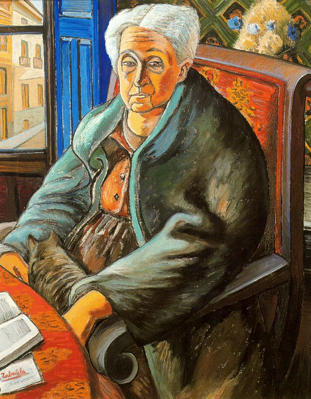Y también: “En cuanto a la relación de Zabaleta con los gatos, nos cuenta su amigo el profesor y escritor D. Juan Pasquau: “Cuando fui a verle en vida habitaba una de esas casas, tan características de los pueblos, de poca apariencia externa, pero de interiores complicados y espaciosos. Me llamaron la atención los gatos que en la casa de Zabaleta pululaban por todas partes. Enigmáticos gatos lucios y displicentes en el descanso de la escalera, en el portal, en la salita y hasta en la misma habitación-estudio del artista. Le pregunté si significaban algo en su obra y me respondió que nada; que estaban allí por afición del «ama» (Eulogia) que dirigía los menesteres domésticos de la casa. Zabaleta, soltero y solitario, no era muy conversador, pero recargaba vivaz el acento de cada palabra”.