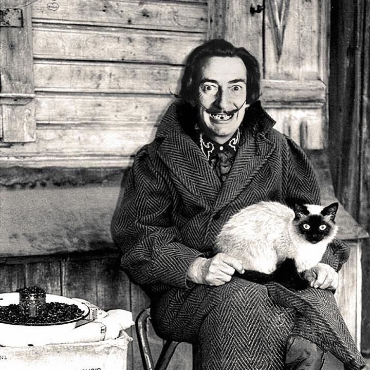 Siempre se dice que a Salvador Dalí (de nombre completo Salvador Domingo Felipe Jacinto Dalí i Domènech, nacido el 11 de mayo de 1904) le gustaban los gatos. Bueno, puede ser, pero sinceramente lo dudamos. El hecho de que tuviera un ocelote no demuestra para nada que le gustaran. Era un ocelote llamado Babou al que paseó alegremente por el mundo atado a una fina cadena de oro. Hay un sinfín de anécdotas acerca de Babou, cómo se escapó un día en el lujoso hotel Meurice de París y toda la clientela salió huyendo…
