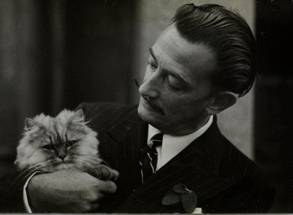 Dalí tenía un ocelote y no un gato por la sencilla razón de que un gato no habría llamado la atención, pero un ocelote sí. Hay pocas fotografías del pintor con un gato en brazos, solo hemos podido encontrar dos. En una de ellas se le ve con un gato de pelo largo, sujetando sus patas delanteras a modo de precaución, lo que podría indicar que no le daban miedo y estaba acostumbrado a cogerlos. Puede haber sido realizada a finales de los años 40.