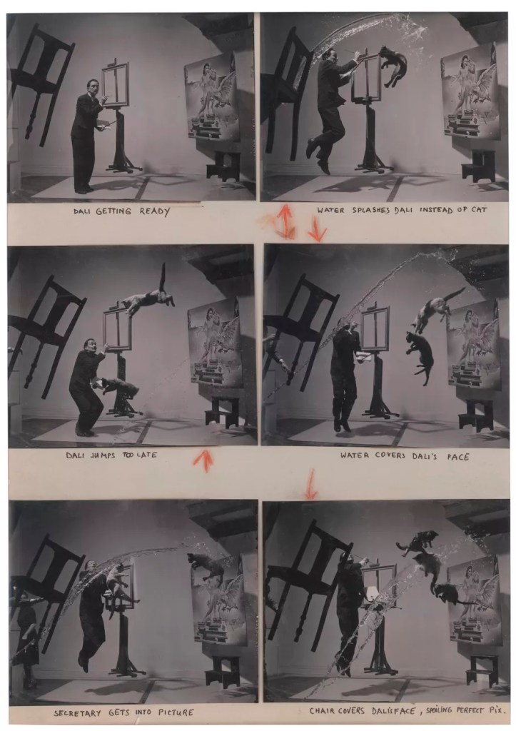 En las seis fotografías rechazadas por el fotógrafo se leen las siguientes anotaciones empezando desde arriba a la izquierda: “Dali se prepara”, “El agua salpica a Dalí en vez de a los gatos”, “Dalí salta demasiado tarde”, “El agua tapa la cara de Dalí”, “El secretario se mete en la foto” y “La silla tapa la cara de Dalí estropeando una foto perfecta”.