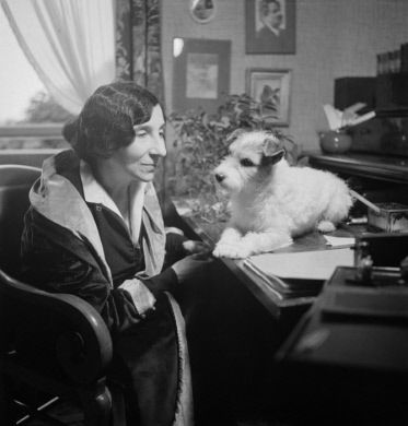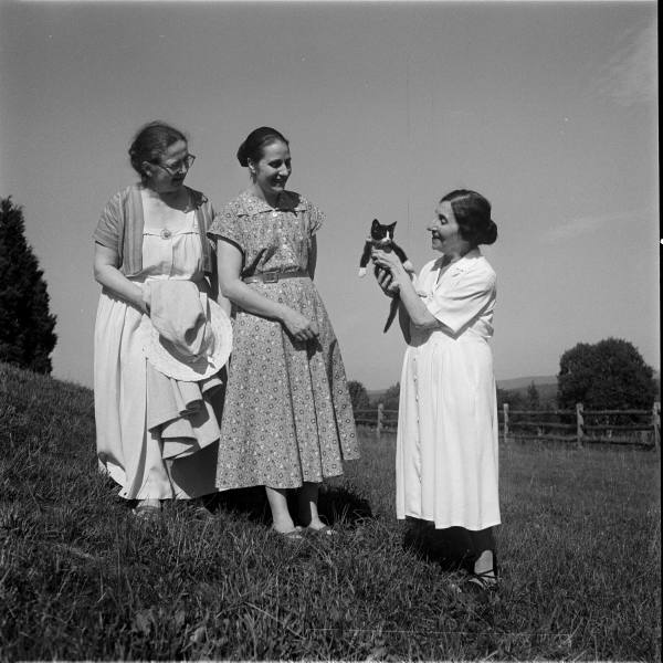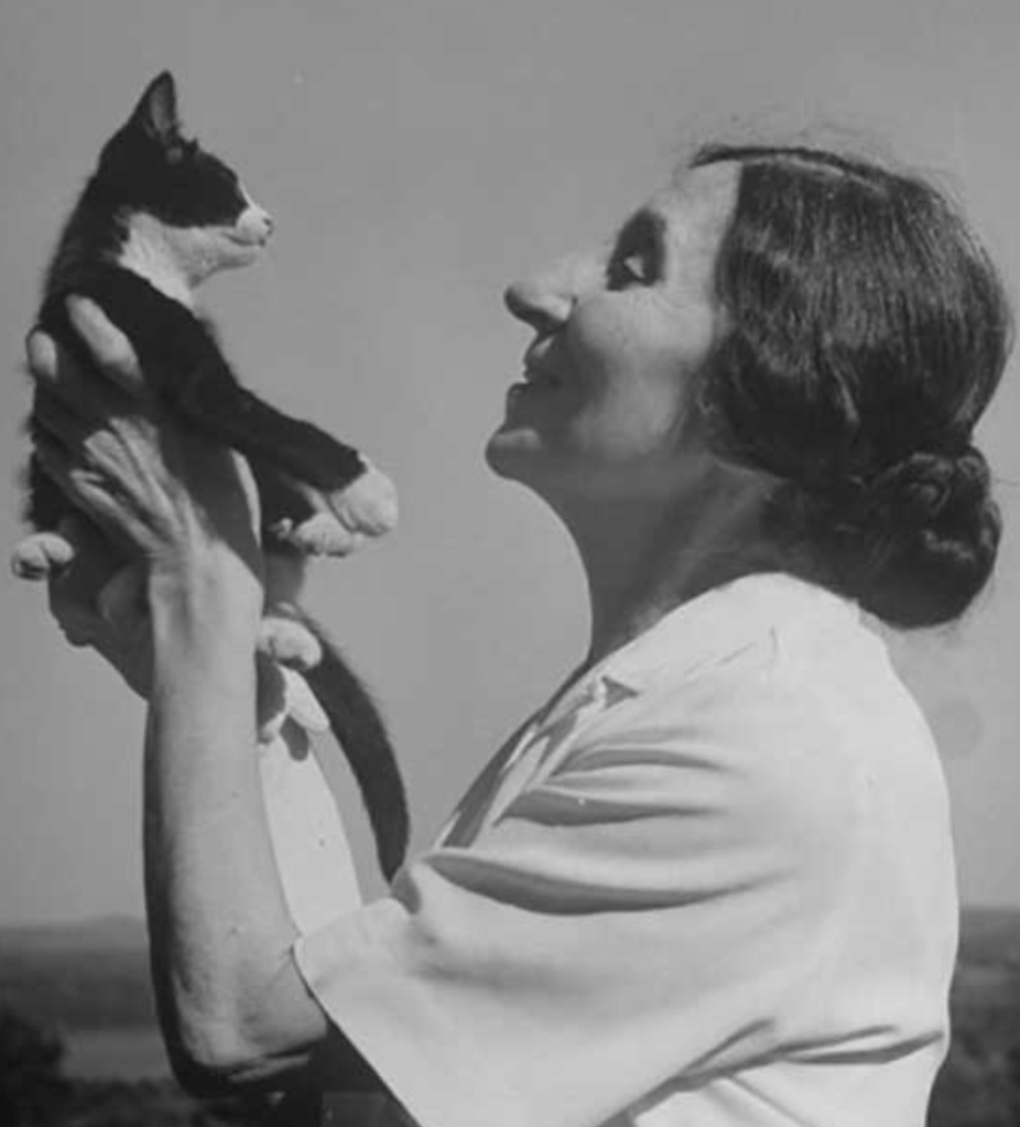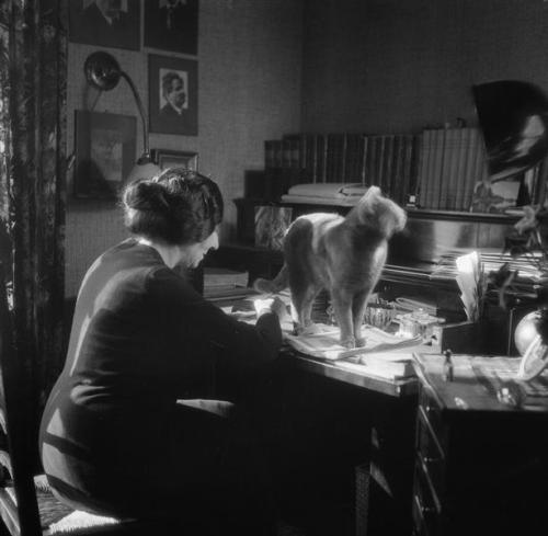 En una de las fotos que hemos encontrado, la vemos alzando a un gatito blanco y negro con dos mujeres, una de ellas, la del vestido estampado, es Denise Restout, que primero fue su alumna antes de convertirse en su fiel compañera. Ese mismo gato podría estar sentado en el clavecín en 1931. En otra, ya de 1933, está sentada delante de su escritorio con otro gato de un solo color, que se ve bastante mal (la foto está movida) y que aparece en otras dos.