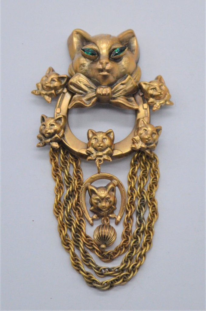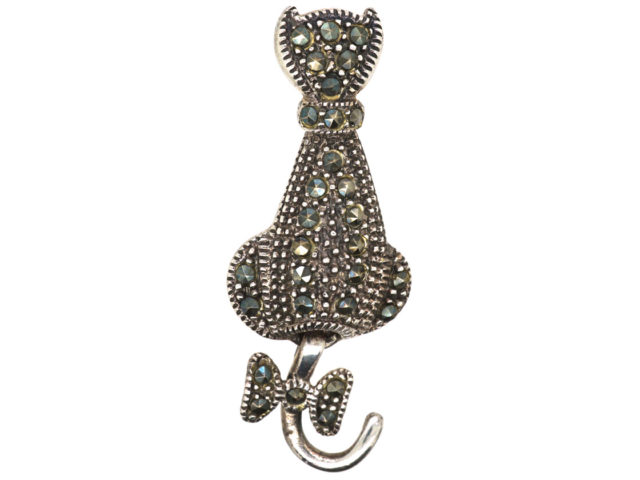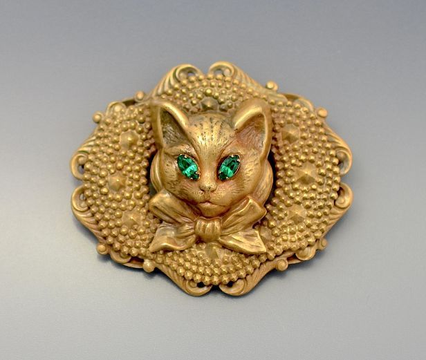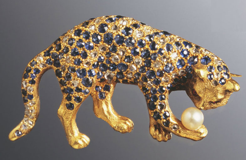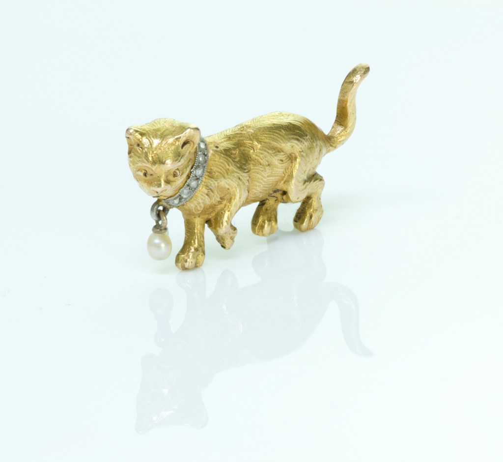 Estados Unidos no iba a quedarse atrás; este broche de finales del siglo XIX de oro, zafiros y diamantes representando a un gato jugando con una perla está valorado en casi 3.000 dólares.