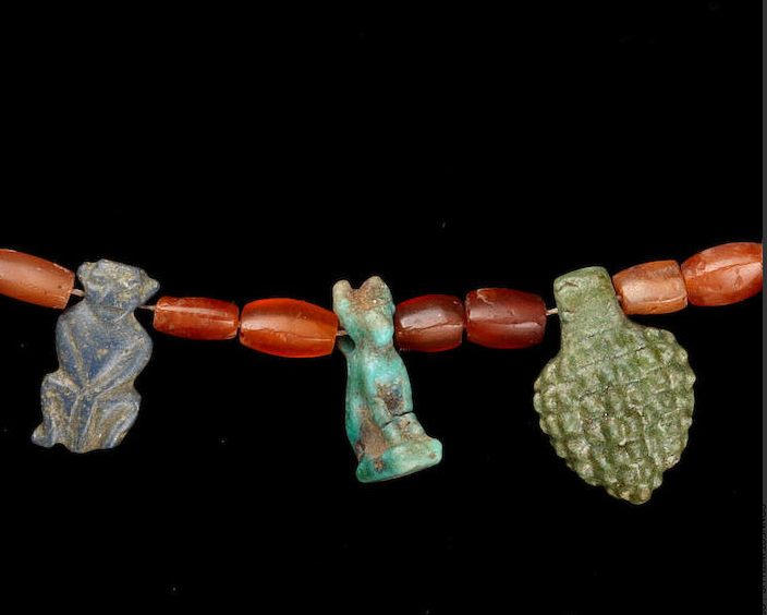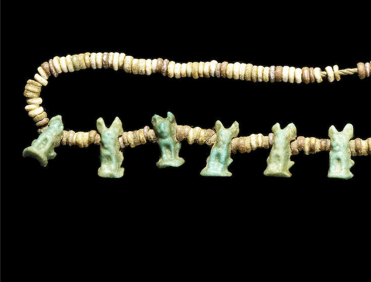 Sin embargo, los primeros en representar al gato en adornos personales fueron los egipcios, como puede verse en estos dos collares. En el primero, un gato está rodeado por un mono y una granada; en el segundo, varias figuras felinas pequeñas embellecen un collar de sencillas cuentas.