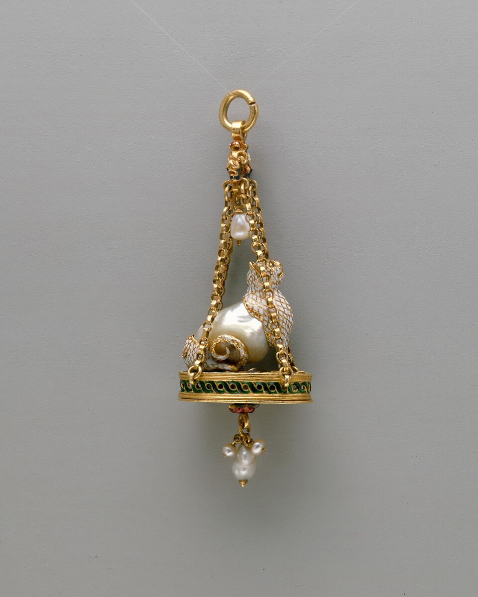 La siguiente alhaja – porque se trata una auténtica alhaja – es un colgante representando a un gato sentado. Yvonne Hackenbroch (conservadora del Museo Británico y del Metropolitano de Nueva York) lo atribuyó a un joyero español de finales del siglo XVI. Un dibujo muy similar de Gabriell Gomar, del año 1603, se encuentra en los “Llibres de Passanties” del Archivo Histórico de la Ciudad de Barcelona, que abarcan la historia de la orfebrería catalana desde 1500 a 1833. Hasta hace unos cuarenta años se consideraba que estos colgantes procedían de centros de orfebrería de Augsburgo y Praga.