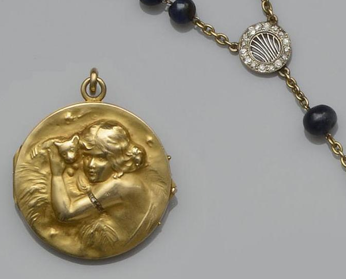 Volvemos al mundo occidental para llegar al Reino Unido en plena era victoriana, cuando el gato empezaba a ocupar un puesto de importancia en la sociedad burguesa y noble. El medallón de oro junto a una cadena adornada con zafiros y diamantes muestra a una mujer acariciando a un gato y es de estilo prerrafaelita.