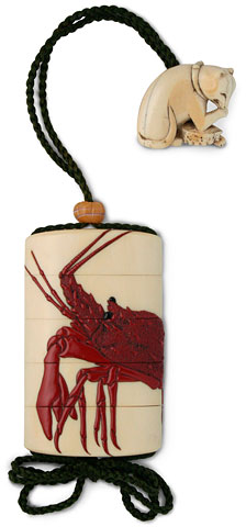 Del siglo XVI saltamos al XVIII y al Extremo Oriente, concretamente a Japón, con dos “netsuke”, esculturas en miniatura ideadas en el siglo XVII con fines prácticos, sujetar la caja o bolsa que colgaba de la faja del kimono masculino, tal como se ve en la foto. El gato agarra una concha de abulón con una pata mientras se lame la otra, quizá saboreando el jugo del molusco. Este primero es del XVIII.