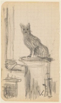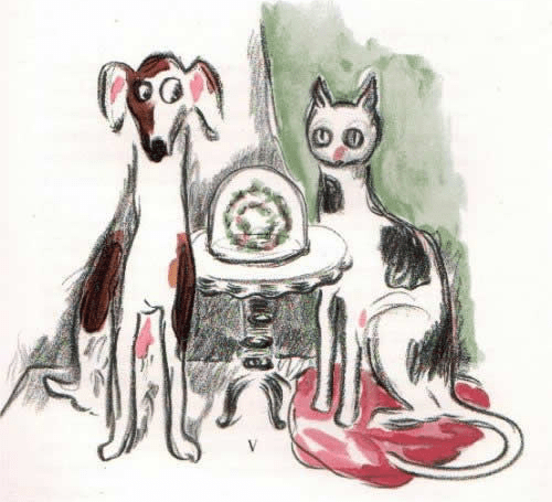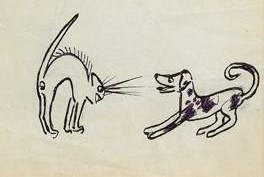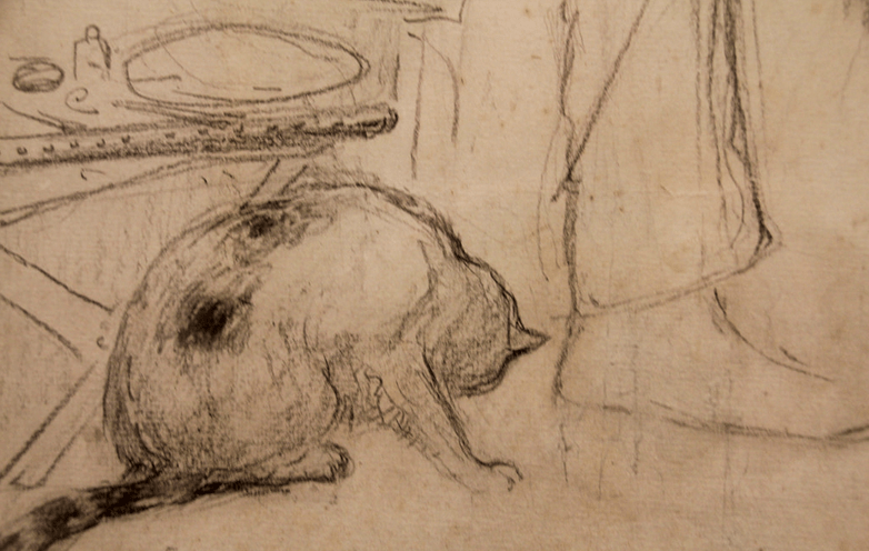 Todo esto nos lleva a creer que Van Dongen debía tener una gata en su inmenso taller y que esta había tenido gatitos. En la esquina inferior derecha dibujó un gato enfrentándose a un perro. El gato tiene el lomo arqueado, el pelo erizado, el rabo muy tieso; sin embargo, el perro parece más bien joven y dispuesto a jugar. Con unos cuantos trazos sencillos plasma a la perfección la actitud de ambos.
