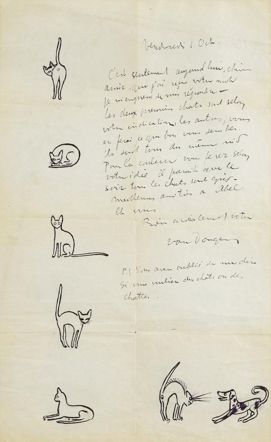 A fuerza de buscar, hemos encontrado una carta del pintor dirigida a una señora desconocida fechada un 1 de octubre, pero sin año, que nos demuestra que Kees van Dongen tenía gatos. En la carta habla de cinco – ¿los gatos dibujados en el margen izquierdo de la carta? – que, según él, son de la misma camada. Al parecer, la señora era una amiga suya interesada en esos gatos. El pintor añade una posdata en la que le pregunta si prefiere gatos o gatas.