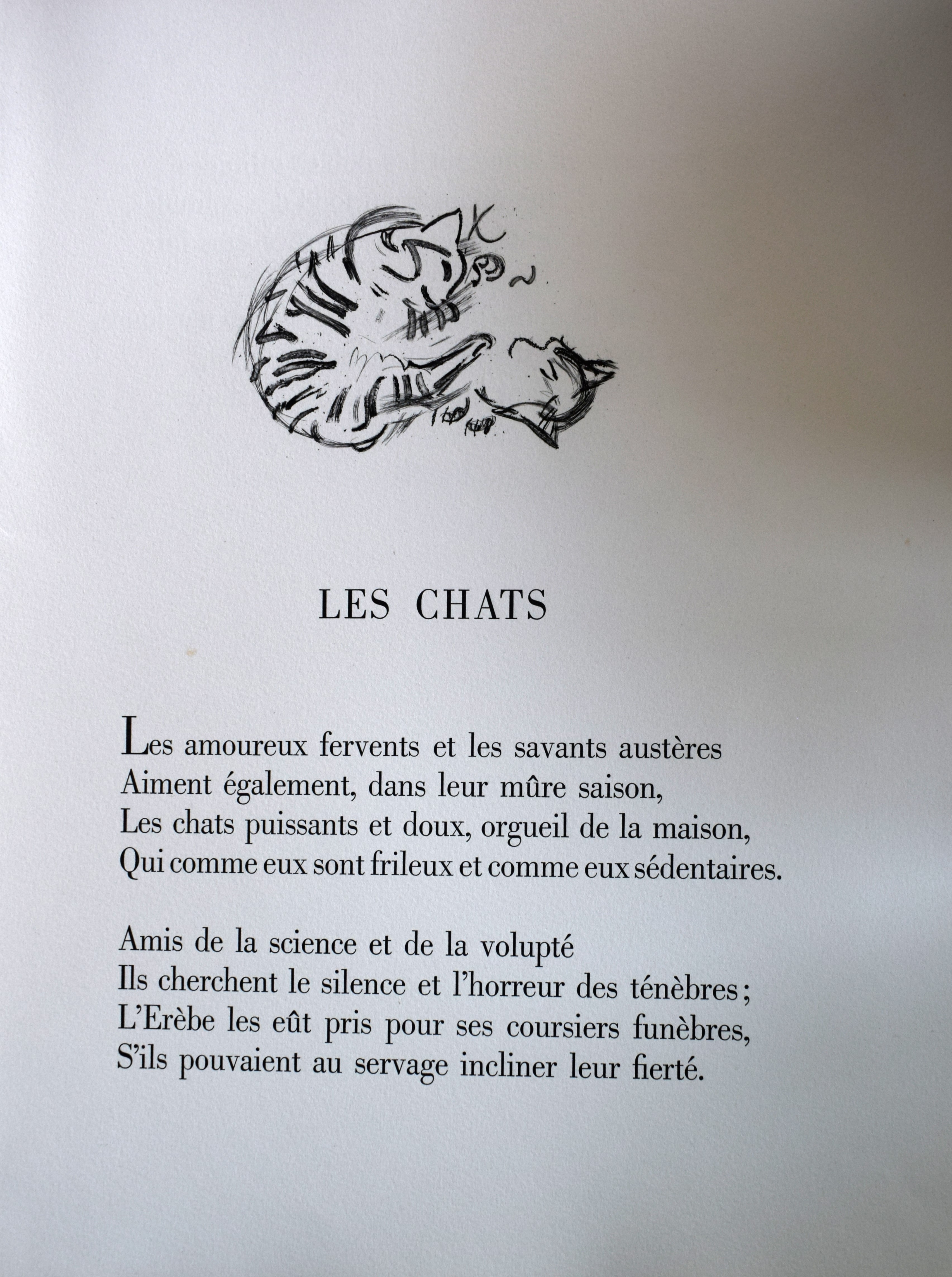 Ilustró el libro de poemas “Las flores del mal”, de Charles Baudelaire, que incluye un poema titulado “Los gatos”, cuyos primeros dos versos dicen así: “Los fervientes amantes y los sabios austeros/aman por igual, al llegar a la época de madurez/a los gatos poderosos y suaves, orgullos del hogar,/frioleros como ellos, sedentarios como ellos”. “Amigos de la ciencia y de la voluptuosidad,/buscan el silencio y el horror de las tinieblas;/Erebo los habría escogido como fúnebres mensajeros/si a la servidumbre pudieran entregar su orgullo”.