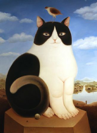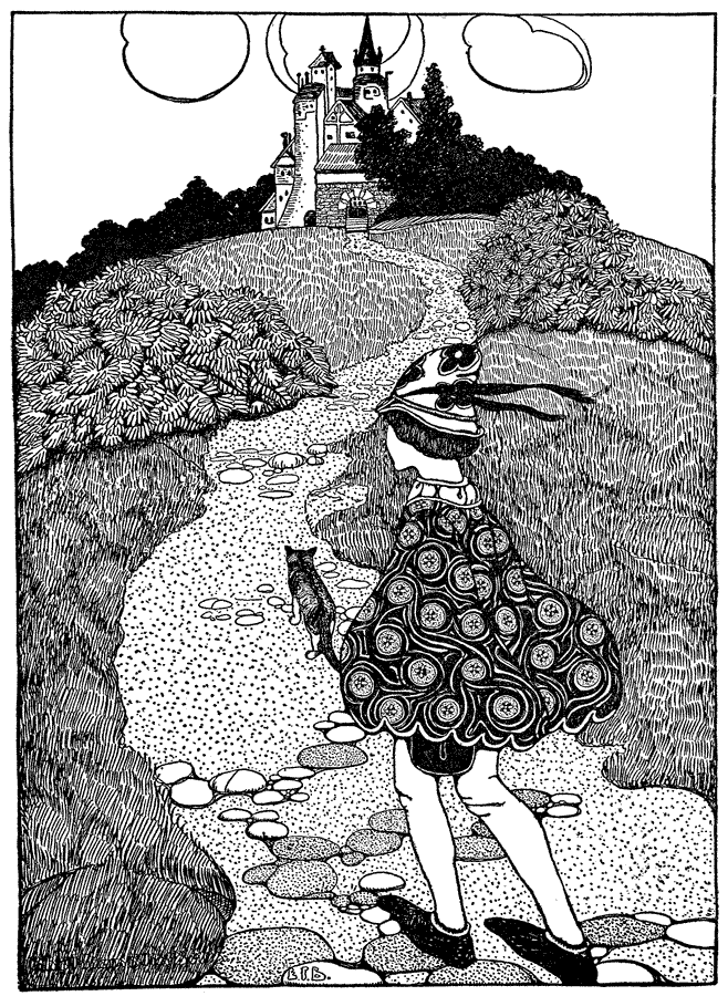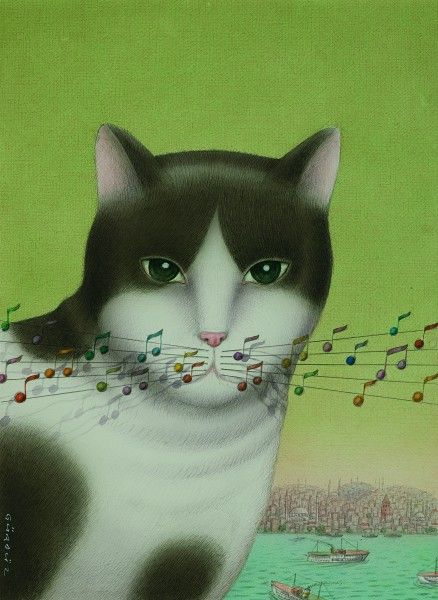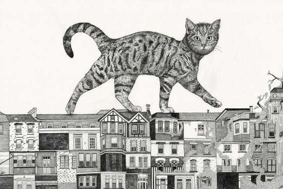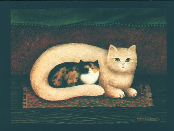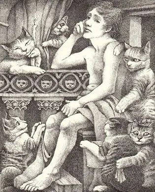 “Qué gata tan maravillosa”, pensó Hans, muerto de curiosidad, y la siguió hasta su castillo encantado, donde solo habitaban gatos para servirla. Cenaron mientras tres gatos tocaban, uno el fagot, otro el violín y el tercero, con las mejillas muy hinchadas, la trompeta. La gata hizo apartar la mesa e invito a Hans a bailar con ella, pero Hans se negó, nunca había bailado con una gatita.