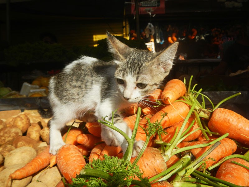 Los gatos requieren una dieta con un elevado contenido proteínico y las plantas no tienen suficientes proteínas de alta calidad fácilmente digestible para cubrir los requisitos diarios de un gato. Además, les cuesta mucho digerir los hidratos de carbono por una sencilla razón: los intestinos de un gato son mucho más cortos que los de un perro. La proporción es de 4:1 en un felino comparado al 6:1 de los caninos.