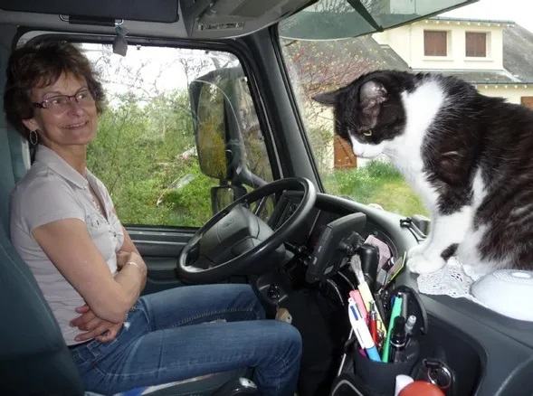 Pero no todas las empresas permiten viajar con animales. Los gatos camioneros que cruzan fronteras deberán llevar un pasaporte en regla y algunos países pondrán más trabas que otros para dejarlos entrar, pero para Sylvie y Filou da igual. Llevan 14 años recorriendo Europa a bordo de un 38 toneladas y poco importan las fronteras, España, Alemania, Bélgica, Holanda, Suiza y a menudo Italia son paisajes habituales para los dos. Sylvie no entra en un restaurante si no aceptan a Filou: “Donde voy yo, va él”, dice. Y añade, riendo: “Nadie me pregunta cómo estoy yo, sino cómo está Filou”. No le hace falta un arnés, es un gato muy tranquilo y duerme en el salpicadero, en el asiento de pasajeros o en su litera.