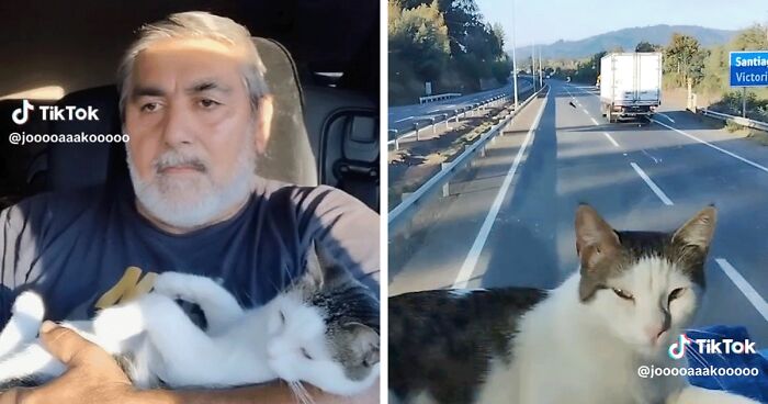 De Francia pasamos a Turquía, donde Samet Ayyuldiz cuenta cómo encontró a su pequeño compañero: “Vi a alguien tirar algo desde una ventanilla de un coche; no sé por qué, pero frené y paré. Vi a un gato diminuto maullando. Le llevé al veterinario más cercano; era demasiado pequeño para comer y le di el biberón durante un par de semanas. Ahora somos inseparables, no voy a ninguna parte sin él”.