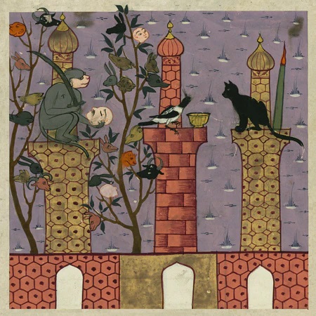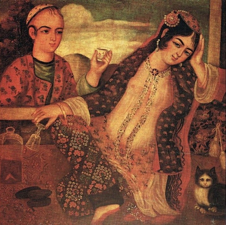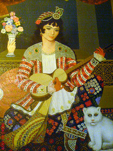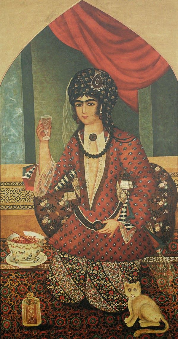 Se dice que el famoso jurista y poeta Emād Faqīh Kermānī – siglo XIV – enseñó a su gato a imitarle durante las cinco oraciones cotidianas. El gato Babrī Khan, cuyo dueño era el rey Naser al-Din Sah Kayar (dinastía Kayar, 1848-1896), también se dio a conocer en una época mucho más reciente. En este mismo periodo de tiempo, se sabe que muchos aristócratas tenían gatos domésticos. En un cuadro de época kayar, un sirviente ofrece una taza a una dama, pero es imposible saber si el gato blanco y negro en la esquina inferior derecha es de pelo largo. Por cierto, en todas las pinturas de mujeres con gato, este último está situado en la esquina inferior derecha. ¿Una convención pictórica de la época?