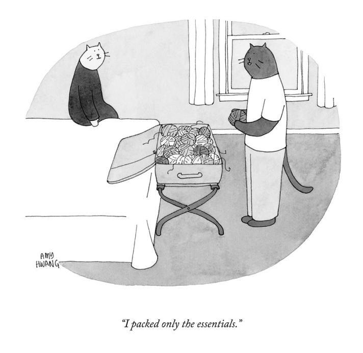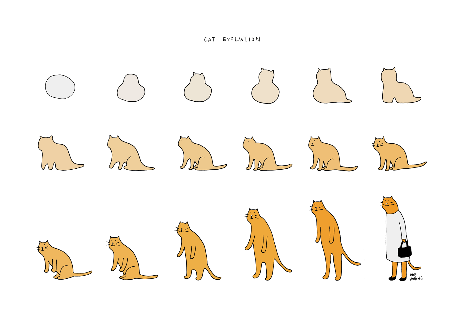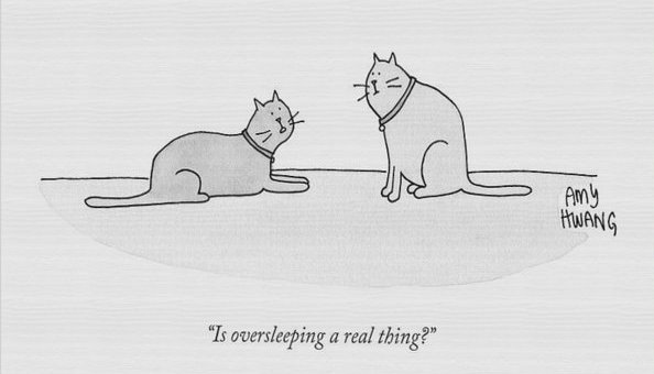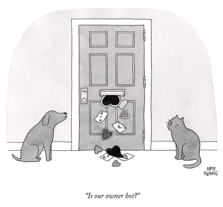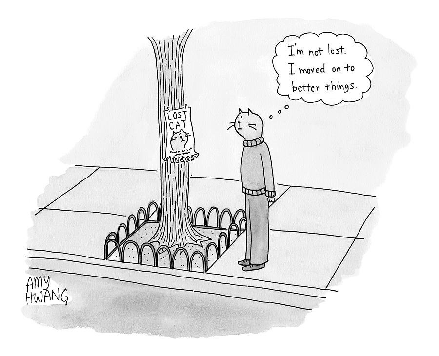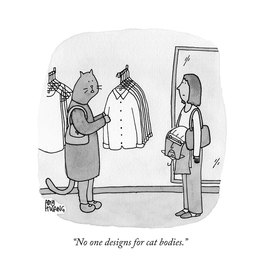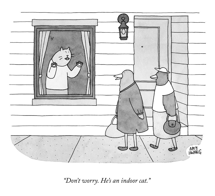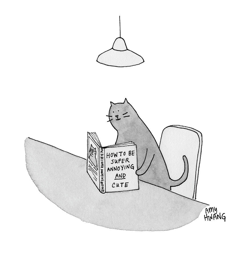 El sentido del humor de Amy Hwang es bastante cáustico y seco, sus dibujos son aparentemente sencillos, a base de grises, pero consiguen su objetivo. Algunas veces no se sabe si los gatos son gatos vestidos de seres humanos o viceversa.