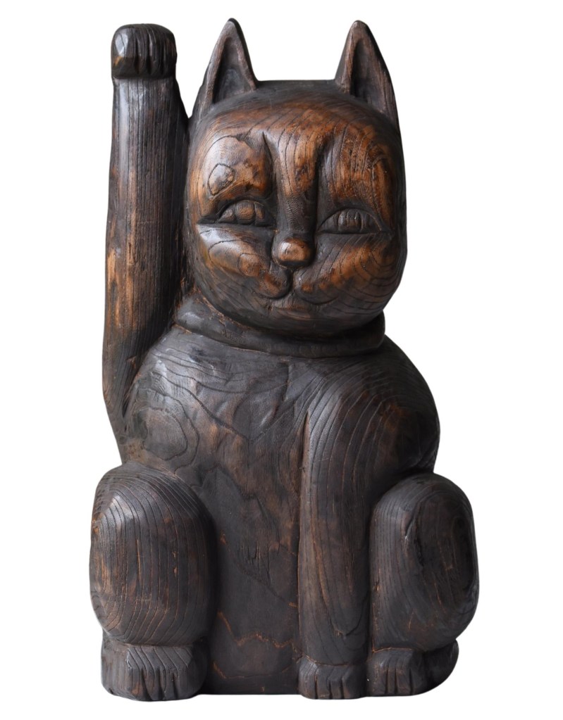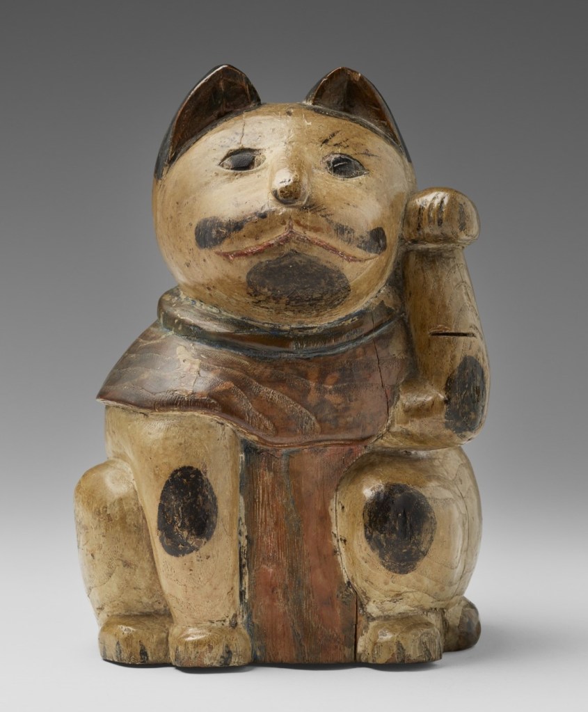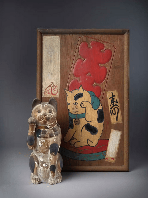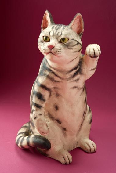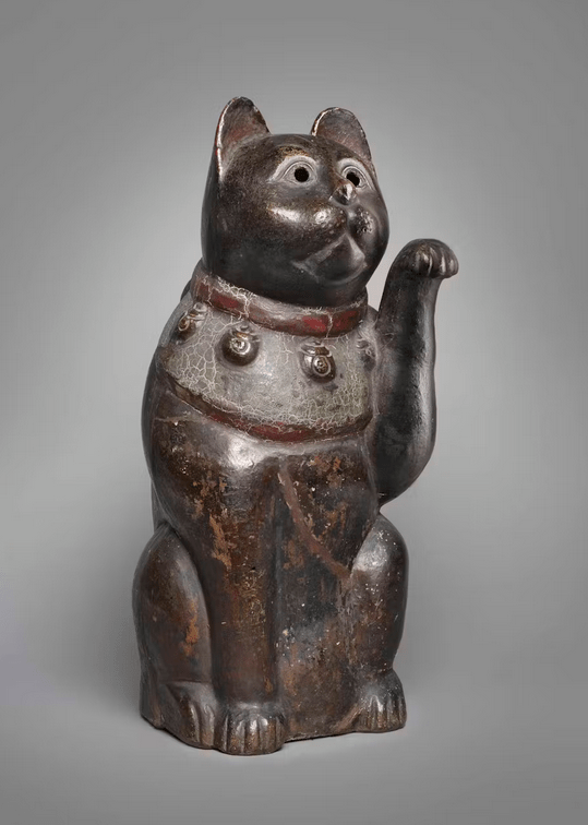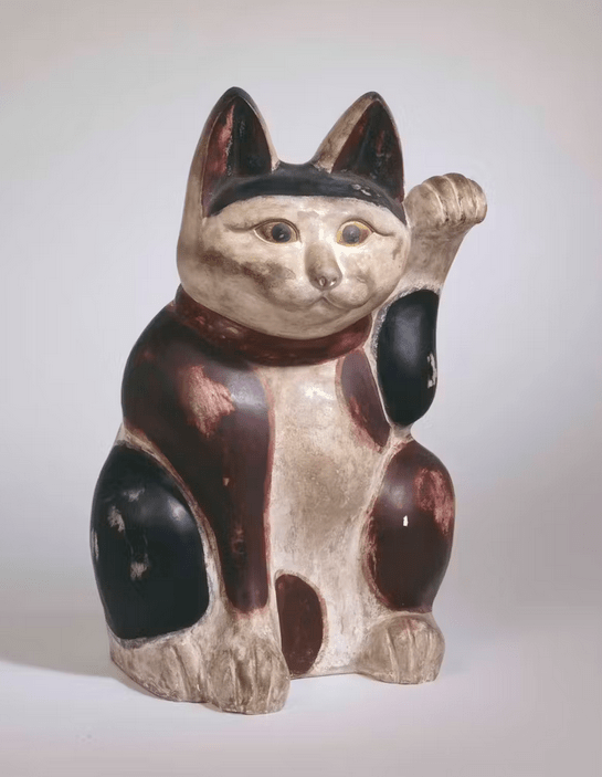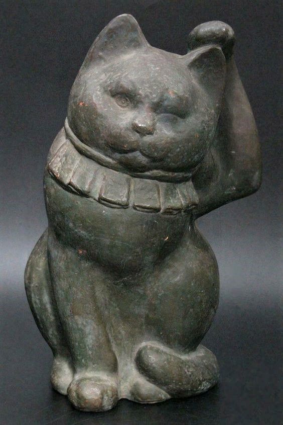 Katherine M. Ball, autora del libro “Animal Motifs in Asian Art” (Motivos animales en el arte asiático), publicado en 1927, describe los maneki-nekos como “sencillas formas de amuletos hechos de barro o papel maché”. Añade que suelen estar en la entrada de restaurantes y tiendas para invitar al cliente a entrar, lo que nos hace pensar que se refiere a unas figuras de cierto tamaño.