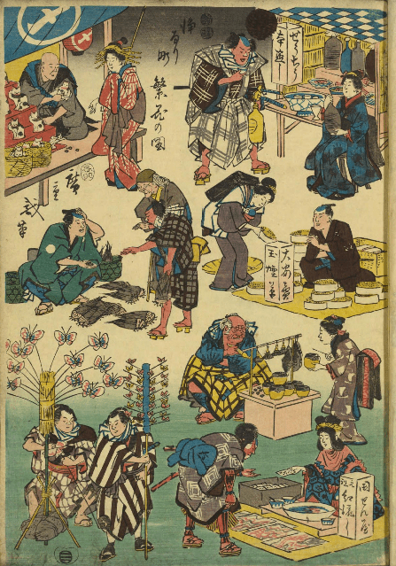 La popularidad del famoso gato de la buena suerte, el maneki-neko japonés (literalmente “el gato que llama”), remonta al siglo XIX, aunque las diversas leyendas que dieron pie a su existencia pueden ser bastante más antiguas. En este grabado de Utagawa Hiroshige de 1852 se ve en la esquina superior izquierda un puesto en un mercado con maneki-nekos expuestos para su venta.