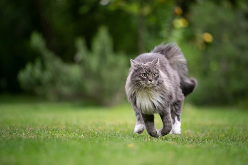 Su forma de moverse hace que dos o tres patas toquen el suelo a la vez cuando anda, dependiendo de la velocidad. En general, la cola estará erguida y perfectamente alineada con la espina dorsal. Digamos que anda en cuatro movimientos. Pero si el gato acelera y va al trote, todo cambia, las patas opuestas y en diagonal tocan el suelo a la vez y realiza dos movimientos con su cuerpo.