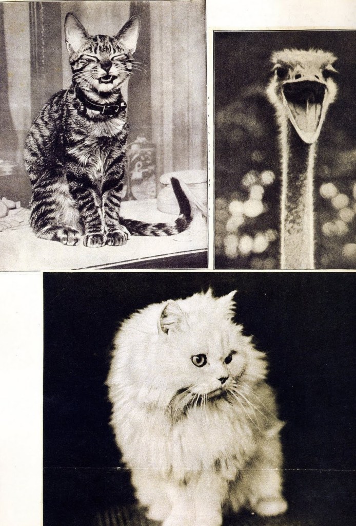 Pero los gatos casi nunca están solos. Las asociaciones son de lo más diverso, y una de las más divertidas quizá sea la página con dos gatos y un emú donde el gatito de la izquierda y el emú de la derecha tienen la boca abierta.