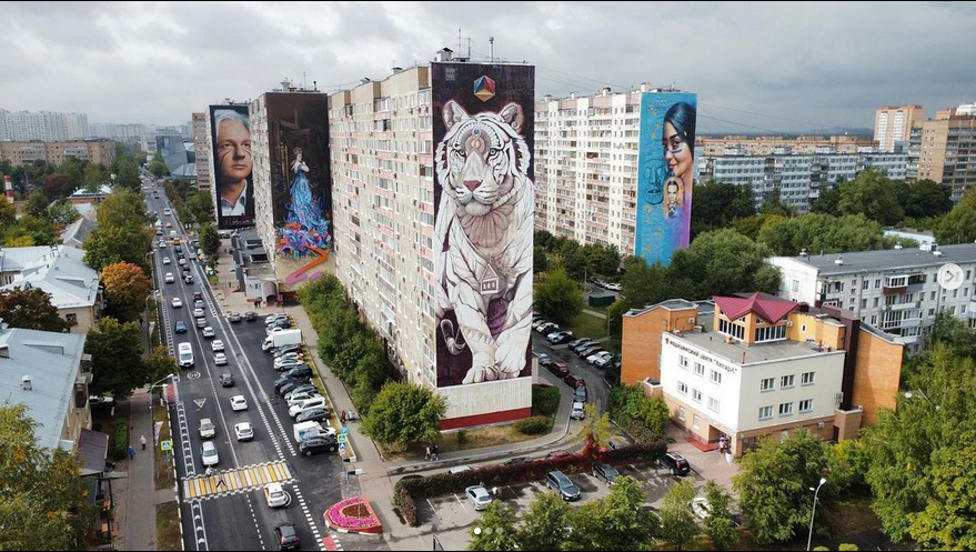 Desde luego, sus murales cambian el día a los transeúntes. El lateral ciego de un inmenso inmueble de catorce pisos en Balashija, en la región de Moscú, luce un espléndido tigre de Siberia de cuyo cuello cuelga una casa y en la frente luce una piedra preciosa. Fue pintado en 2022 con ocasión de un festival internacional de arte urbano en el que sesenta artistas de diez naciones crearon cuarenta murales en los laterales de edificios.