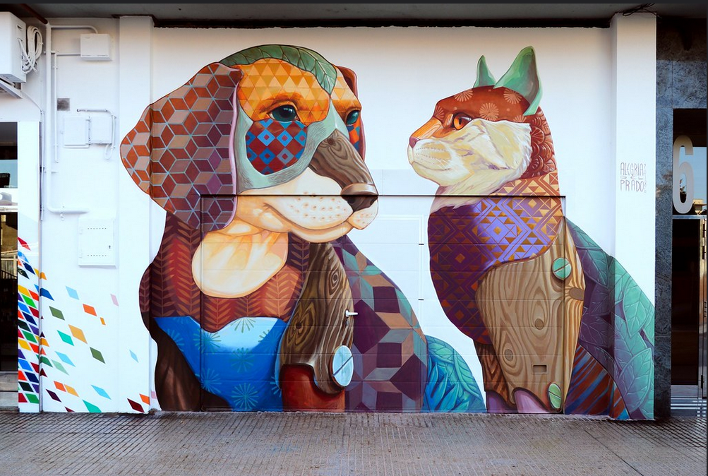También hacen murales más sencillos. Aunque mirando bien el de la clínica veterinaria Río Vena, en Burgos, titulado “El guardián”, de sencillo no tiene nada. O el divertido “Perro y gato” en otra calle de Burgos.