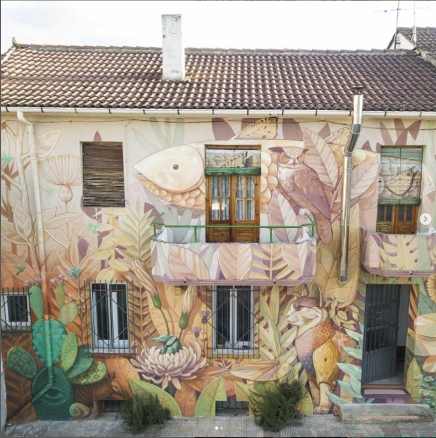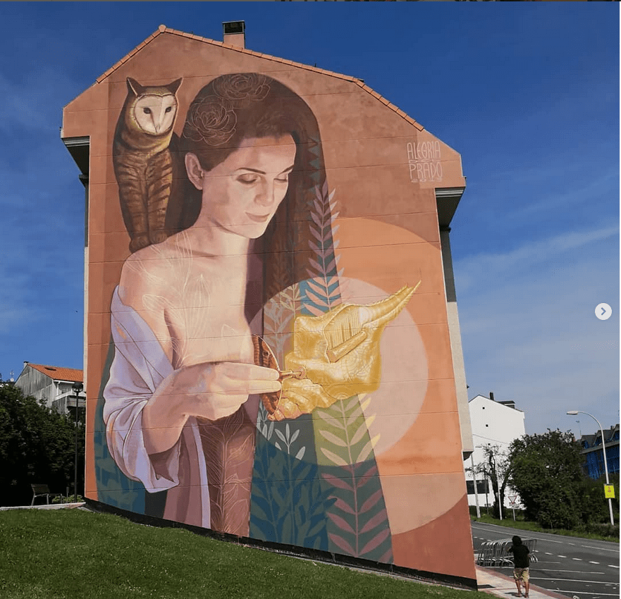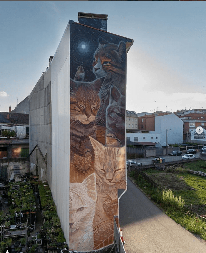 La imaginación de Alegría del Prado no parece conocer límites, pero lo increíble es su atención por el detalle incluso en murales de grandes dimensiones, Un ejemplo es el que pintaron en junio pasado en Carballo (Galicia), con motivo de la nueva edición Rexenera Fest, en un inmueble de la calle Carpinteiros. Cinco gatos, cuatro pájaros y la luna iluminan el antes triste lateral del edificio. No solo la composición es bonita, también los detalles son increíbles; hay que fijarse en el pelo de los gatos, las rayas de sus caras, todo.