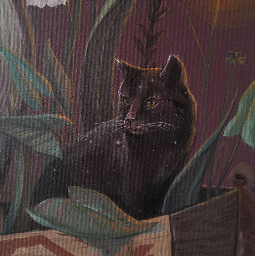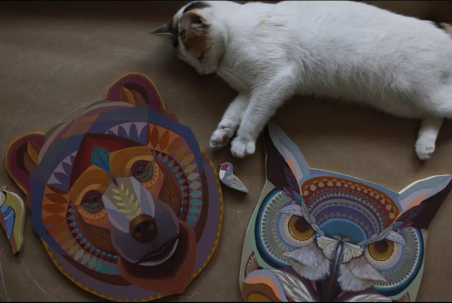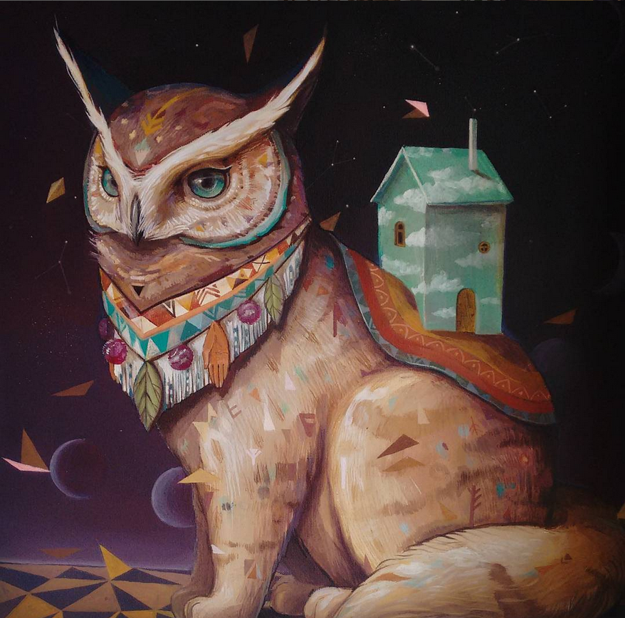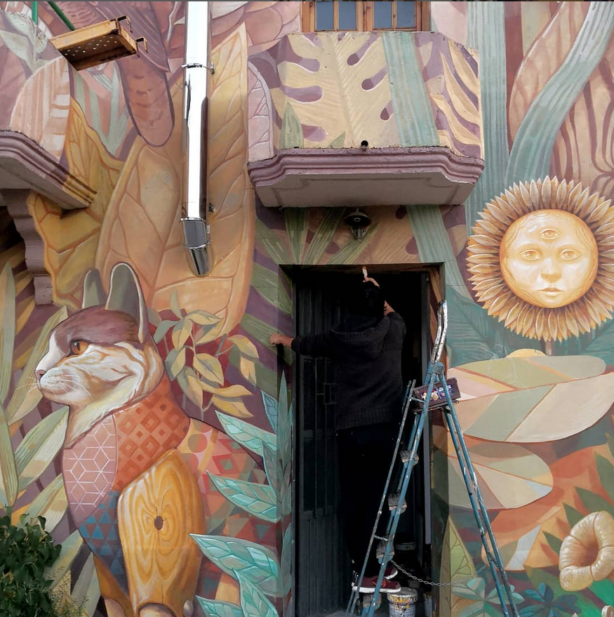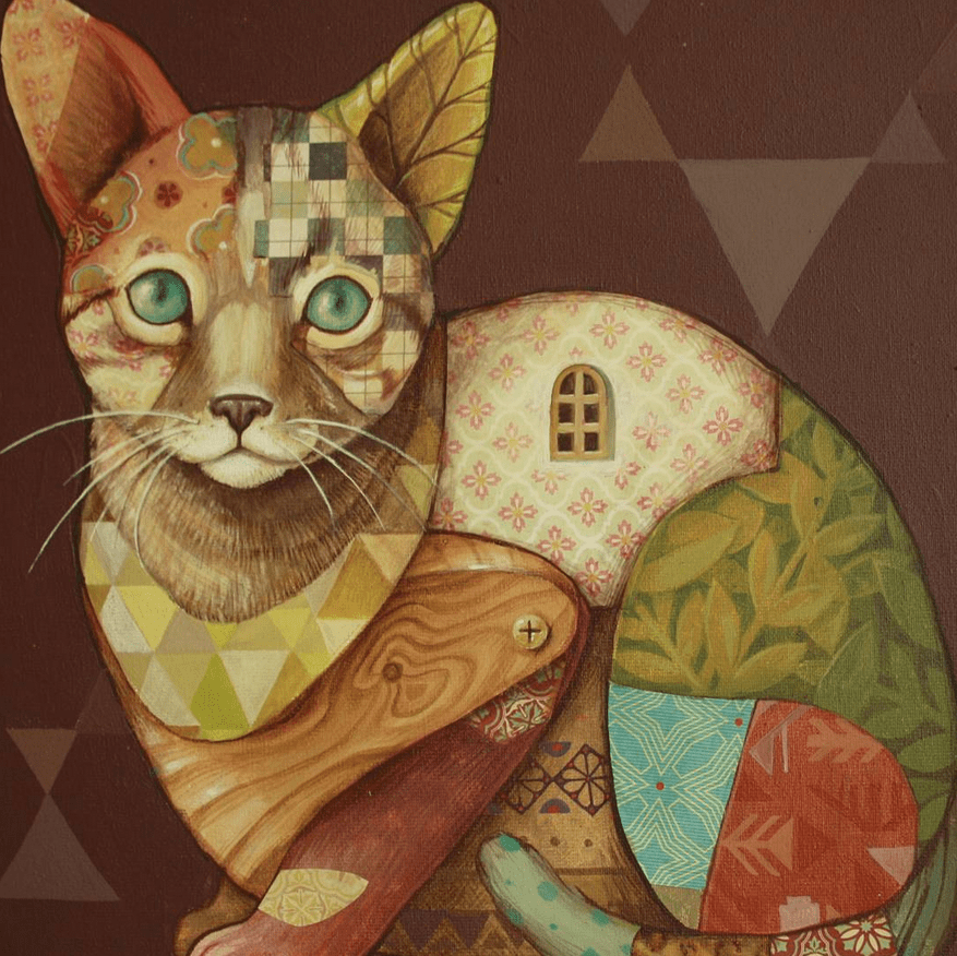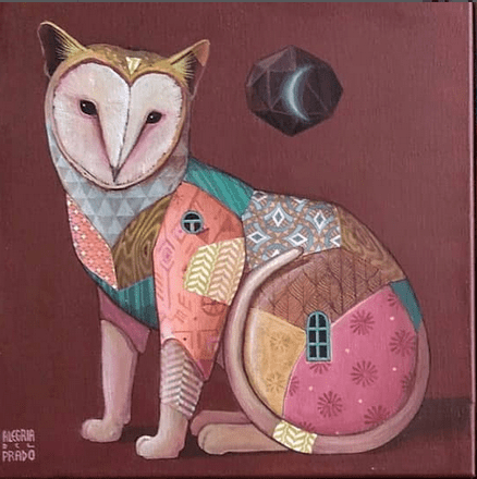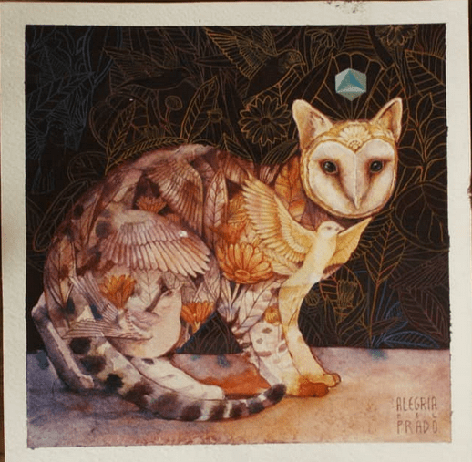 Sus murales y todas sus creaciones están plagadas de antiguos simbolismos en torno a los animales. En realidad, el gato quizá esté entre los animales menos representados por Alegría del Prado, aunque los felinos abundan. Espléndidos todos ellos, por cierto. También hay osos, pájaros y animales fusionados, como el gato lechuza.