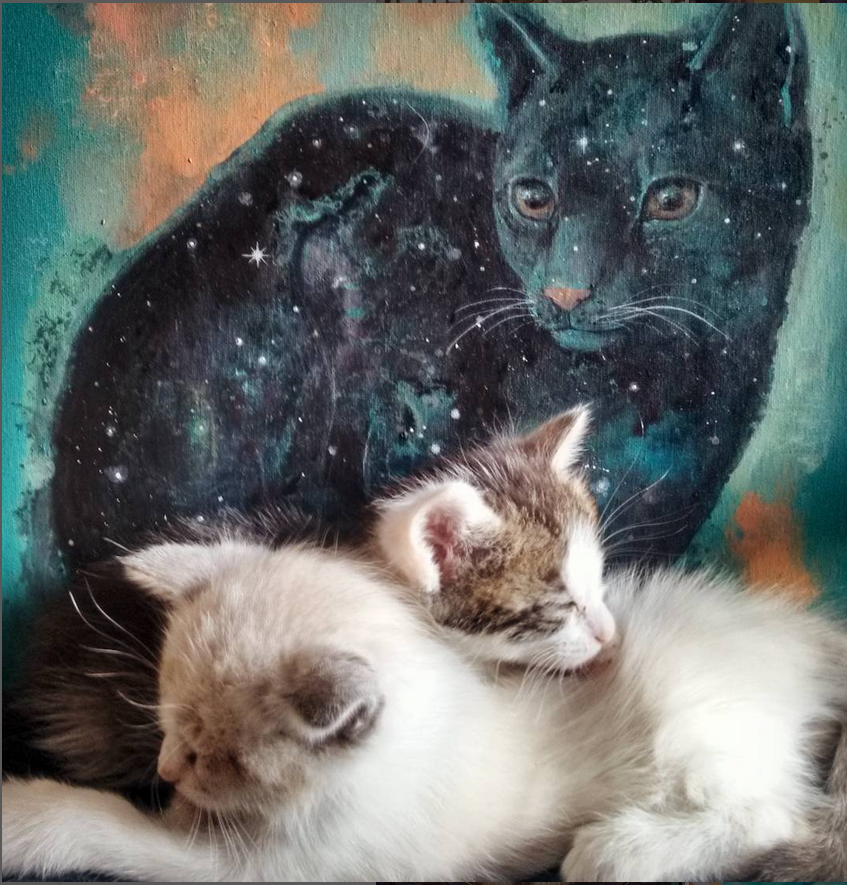 Su obra es muy variada tanto en formatos como en técnicas, y sus murales a gran escala están reconocidos a nivel internacional. Es difícil catalogar su obra, simbólica, onírica, con toques surrealistas… Aunque en realidad no es muy parecida, nos hace pensar en dos pintoras mexicanas de adopción, Remedios Varo y Leonora Carrington, a las que dedicamos sendas entradas (https://gatosyrespeto.org/2017/04/13/los-gatos-surrealistas-de-remedios-varo/ y https://gatosyrespeto.org/?s=leonora+carrington).