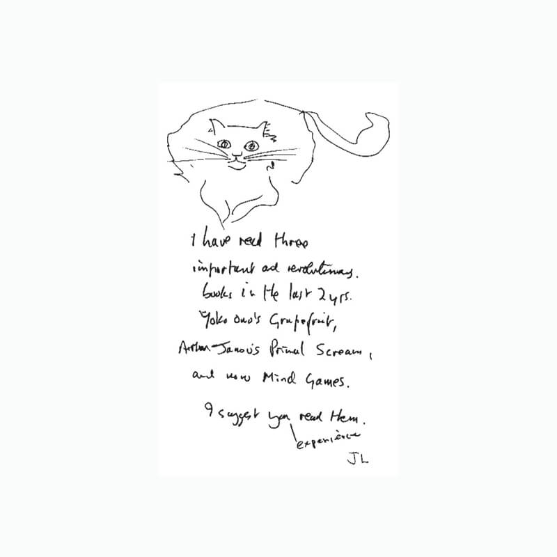 Y para acabar, encabezó una pequeña nota con un gato andando: “He leído tres libros importantes y revolucionarios en los últimos dos años, ‘Grapefuit’, de Yoko Ono; ‘El grito primal’, de Arthur Janov, y ahora ‘Mind Games’. Sugiero que los leas (sientas). J.L.” Dedicamos esta entrevista a la página “Purr’n’Furr” (https://www.purr-n-fur.org.uk/) y a Patrick, su autor, gran amante de los gatos. También está en Facebook.