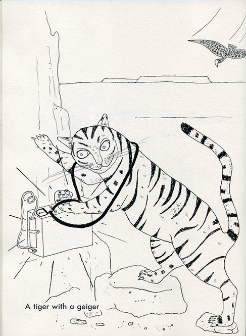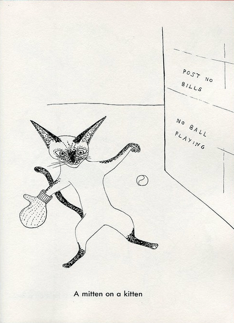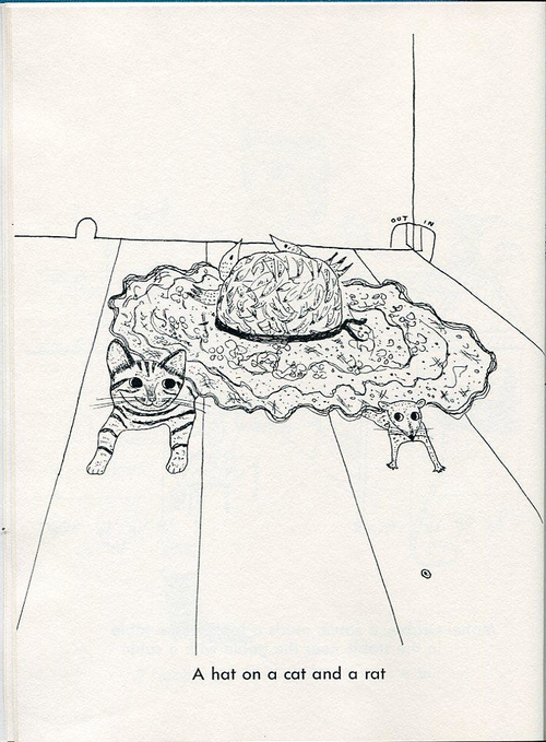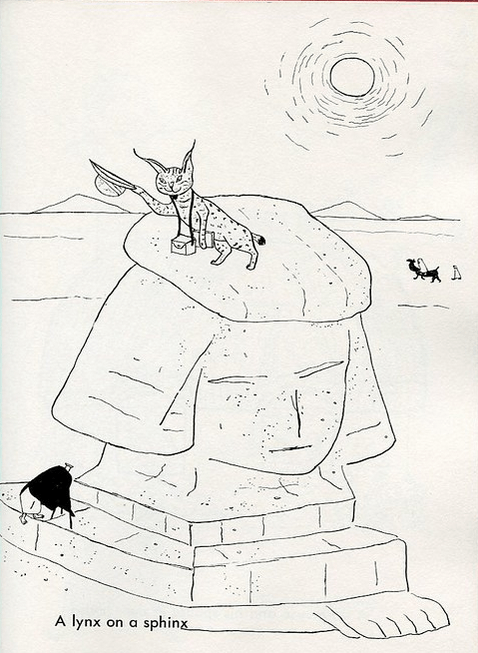 Cada dibujo va acompañado de un pequeño texto rimado que muchos tachan de “literatura sin sentido”, algo con lo que no estamos de acuerdo. Hemos escogido las ilustraciones relativas a los felinos, como por ejemplo “A cat on a hat and a rat” (Un gato en un sombrero y una rata), que en español no rima para nada. Pero sí funciona “A lynx on a sphynx” (Un lince en una esfinge). Sea como sea, y si les apetece ver todas las ilustraciones, pinchen aquí: http://wetoowerechildren.blogspot.com/2010/04/patricia-highsmith-miranda-panda-is-on.html.