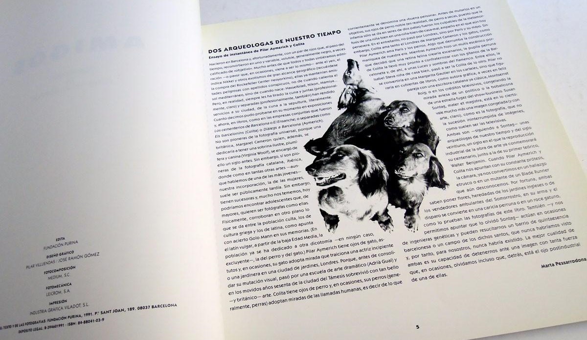¿Por qué unir a Colita y a Pilar Aymerich en un mismo artículo? Muy sencillo: porque juntas realizaron una exposición en la sala Vinçon de Barcelona, inaugurada el 14 de abril de 1992 y promovida por la Fundación Purina, dedicada a gatos y perros. La invitación especificaba que “Su perro y su gato están también cordialmente invitados”. Las fotografías se incluyeron en un libro titulado “Amigos”, con prólogo de Marta Pessarrodona y Anna Maria Moix.