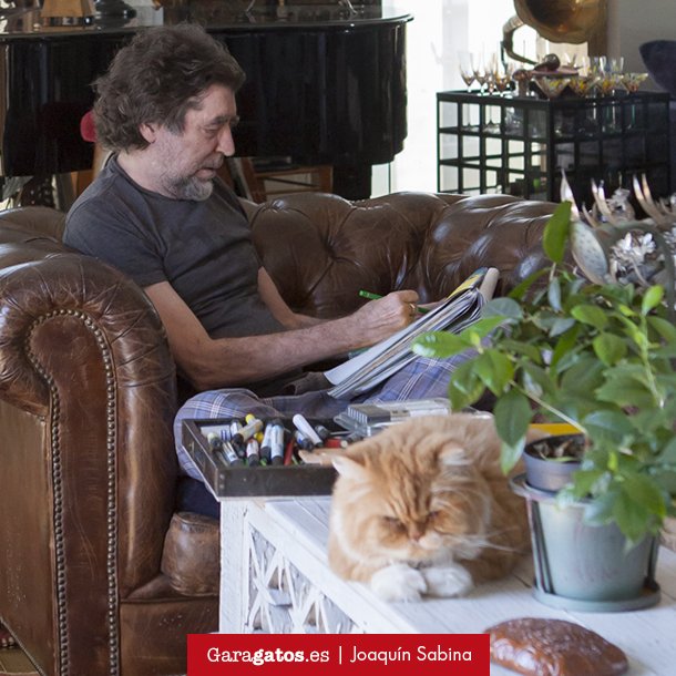 Los fans de Joaquín Sabina saben de sobra que es un amante de los gatos. En la mayoría de fotos que publicamos en este artículo le vemos con Elvis, de lomo y cabeza naranja, tripa y patas blancas, y pelo bastante largo. Pero se cuenta que ha convivido con muchos más y que incluso llegó a tener hasta seis a la vez. Sabemos sus nombres: Judas Tadeo, Margarito, Lúter, Lolo o Lolito, Demon y Margot.