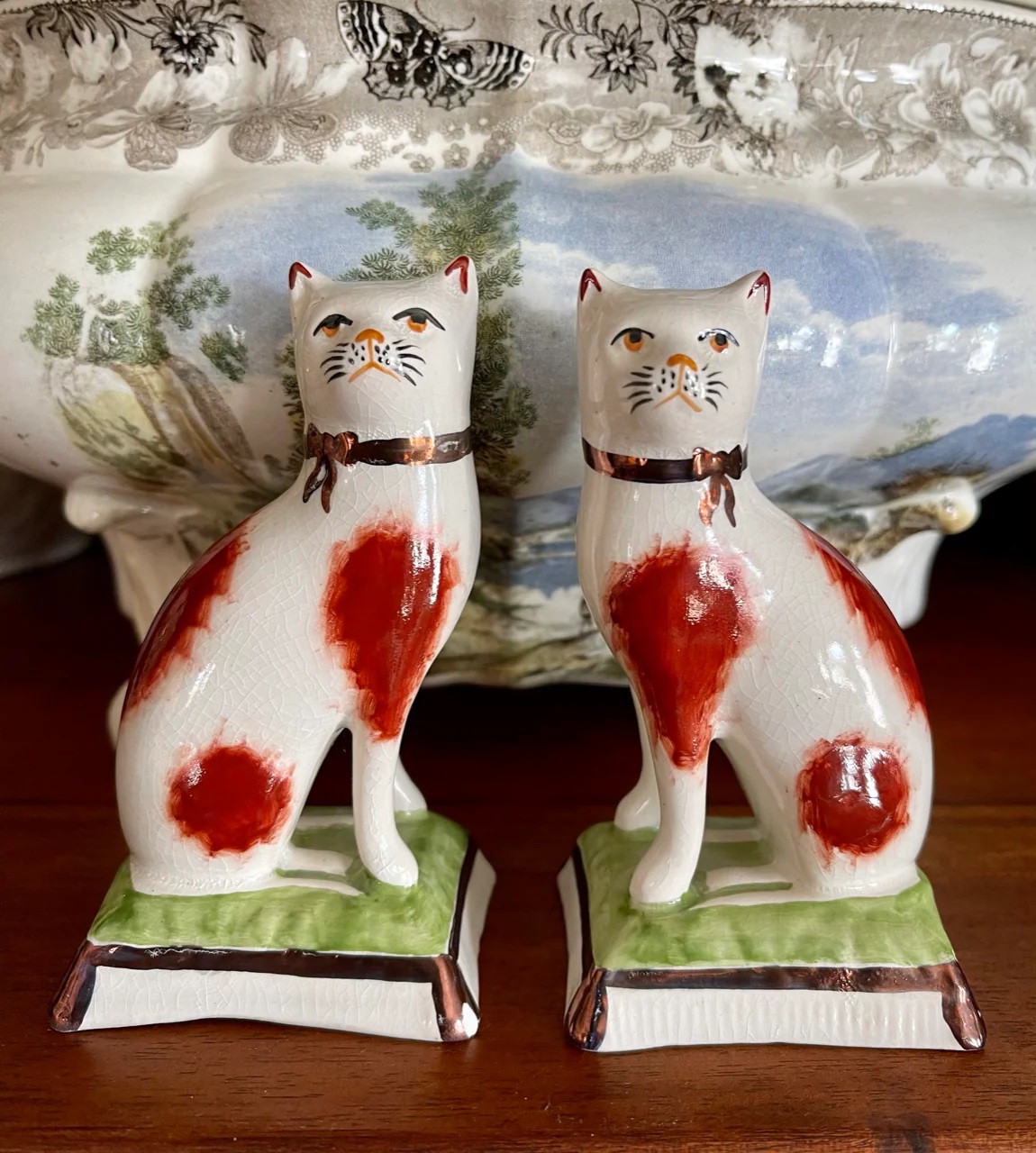 Sin embargo, a partir de 1840, los artesanos de la famosa cerámica de Staffordshire iniciaron la producción de figuras de gatos sentados o reposando y casi siempre en pareja para decorar repisas de chimeneas. Por lo que hemos podido comprobar, el auge de las figuras tuvo lugar entre 1850 y 1920 aproximadamente.