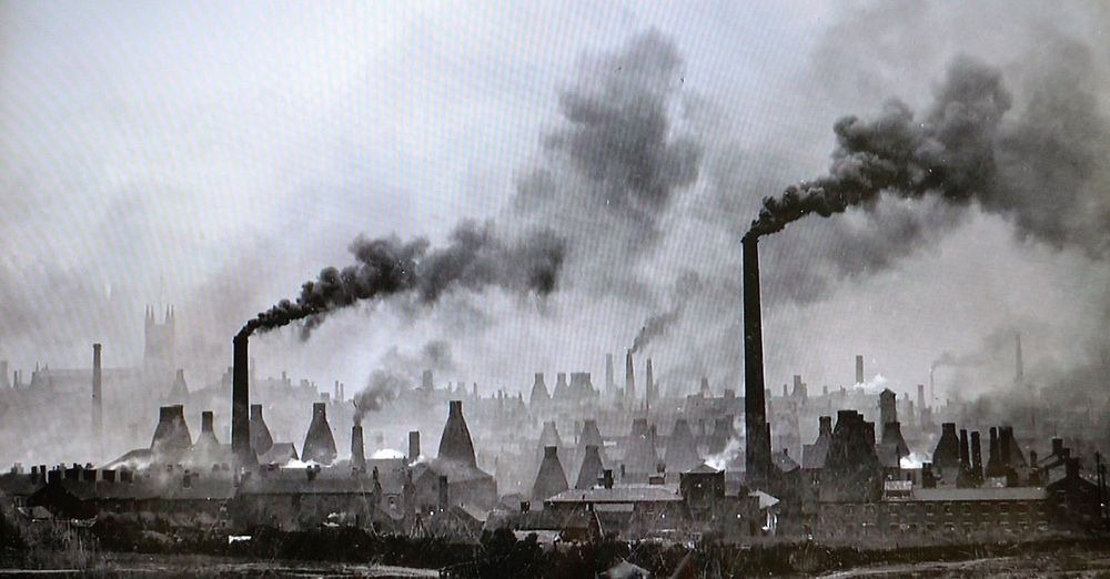 Cada cocción requería catorce toneladas de carbón, y más de la mitad del calor generado se iba en humo por el cuello del horno, que salía a unos veinte metros más arriba antes de volver a caer lentamente y permanecer en el aire como una espesa niebla. En Longton, el pueblo con más hornos, se decía que “era un buen día si se veía el otro lado de la carretera”. Cuando todos estaban encendidos, se hacía de noche.