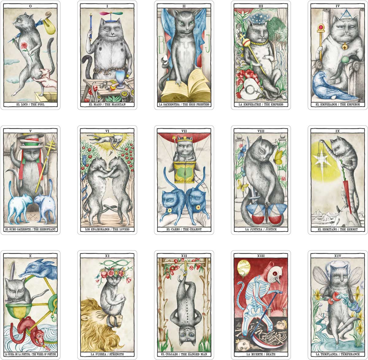 Explica que “en un tarot gatuno los gatos debían de estar representados en mayor o menor manera en todas las cartas del mazo”. Para conseguirlo, tomó el tarot de Marsella como referencia para los Arcanos Mayores, a los que dio actitudes gatunas. Tuvo que buscar en otro tarot los Arcanos Menores con representaciones figurativas y simbólicas en las que basarse.