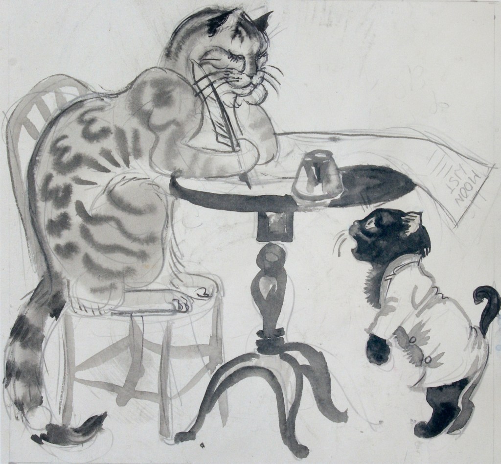 Kathleen Hale introducía un sinfín de detalles en algunos de sus dibujos. Uno de los mejores ejemplos es una página doble correspondiente a una fiesta que dan Orlando y Blanche. En la esquina inferior derecha hay una mesa con una etiqueta que reza: “Dejad los regalos aquí, por favor”. Algunos de estos regalos son un juego de tenedores y cuchillos de pescado, dos figuritas de cerámica de Staffordshire y dos trampas para ratones.