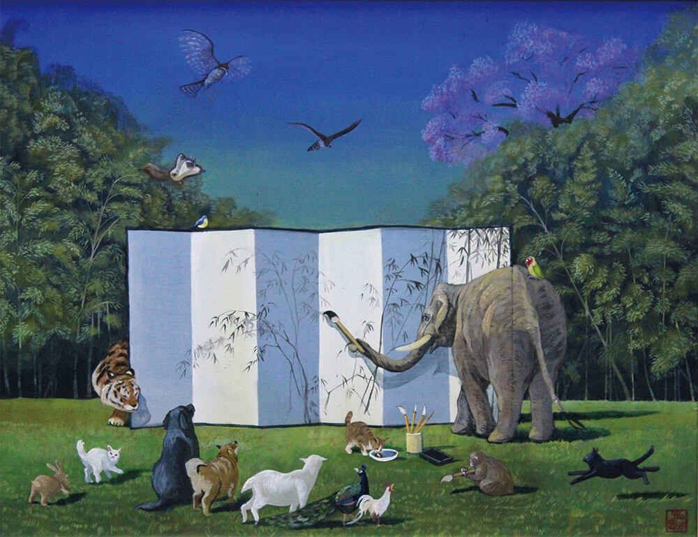 También dicen que los treinta cuadros que se presentan en la exposición cuentan la historia del amor que el pintor siente por los animales. Se inspiró en los numerosos cuadros de animales que pintó Itō Jakuchū (1716-1800), artista de la época Edo, cuando Japón se aisló del mundo exterior.