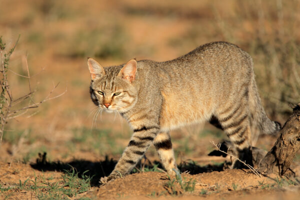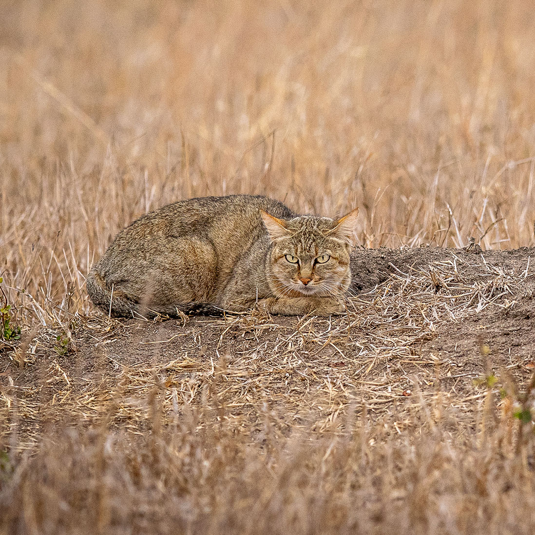 Son activos sobre todo de noche, cuando buscan presas. Tienen un oído extremadamente desarrollado que les permite localizar con gran precisión a las presas, a las que se acercan arrastrándose. Al igual que el gato doméstico, se hincha para intimidar a su enemigo cuando se encuentran. Suele descansar escondido entre matorrales durante el día, aunque puede ser activo en días muy nublados.