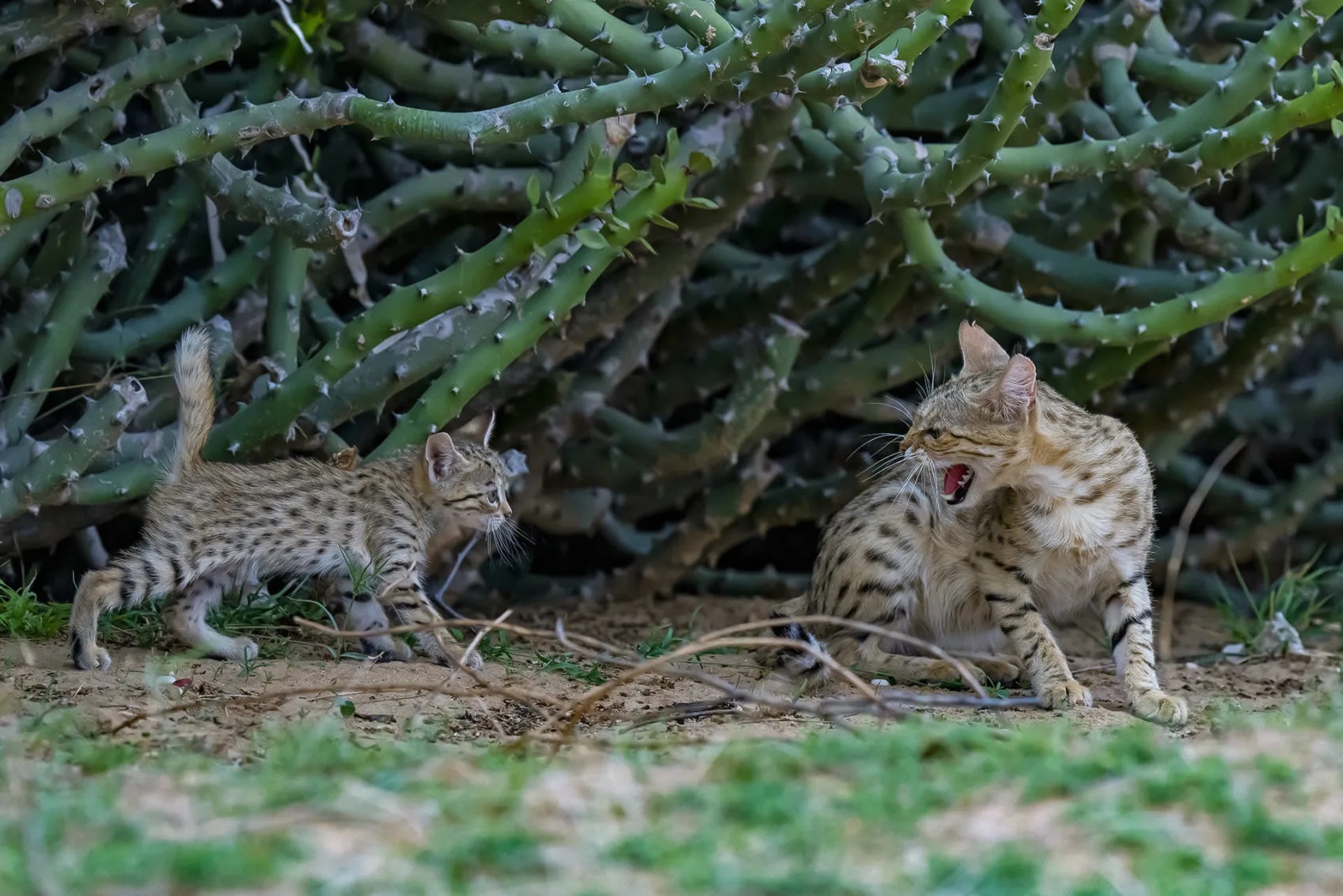 La gestación dura entre 56 y 60 días. Las camadas son de uno a tres cachorros y suelen parir en una guarida – agujero en la roca, el suelo o un árbol hueco – protegida por hierba alta y densa. Los gatitos abren los ojos entre 10 y 14 días después de nacer y se mueven perfectamente al mes. Empiezan a aprender a cazar a los tres meses y se independizan a los seis, más o menos como el gato doméstico.
