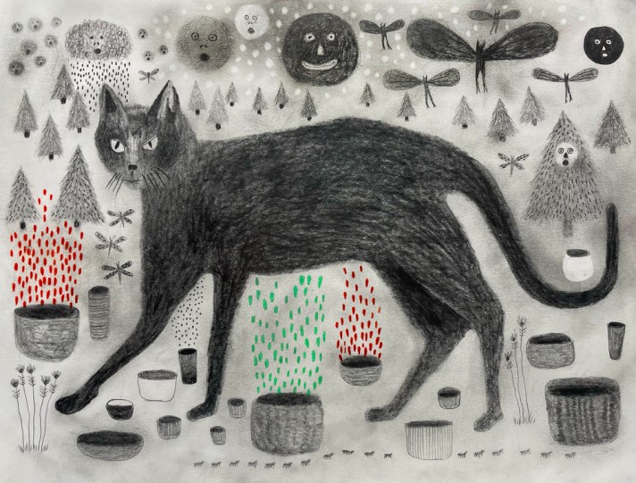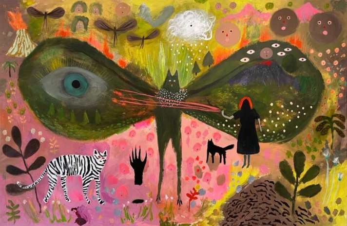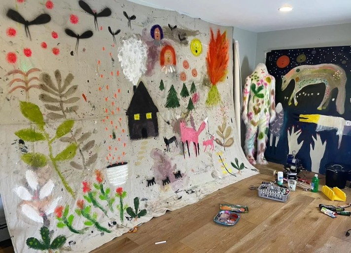 Sin seguir un proceso estricto, puede empezar en un lienzo colocado en un caballete o algo mucho mayor extendido en el suelo. “No sé cómo será el cuadro cuando lo acabe, no tengo una visión predeterminada, solo un tema general, una historia. A veces, la composición aparece rápidamente, todo encaja, pero lo habitual es que vuelva a pintar varias veces algunas zonas del cuadro hasta sentir que está bien”.