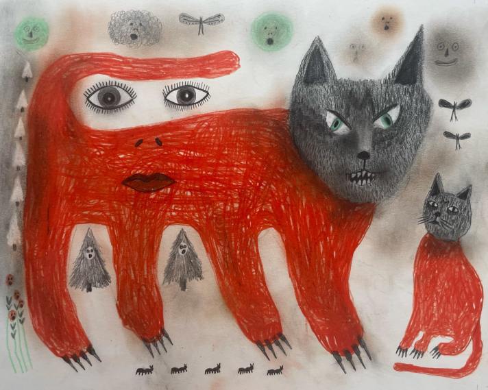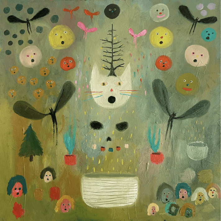 Desde gatos dentudos, pasando por cuervos guardianes, a plantas antropomorfas y rostros incorpóreos, la obra de McGrath se acerca mucho a los trabajos de pintores llamados “primitivos” llenos de simbolismo. Combina varios materiales, como grafito, pintura al óleo y óleos en barra, tinta china y pinturas acrílicas sobre una amplia variedad de superficies, entre ellas la madera, el lienzo y el yute.