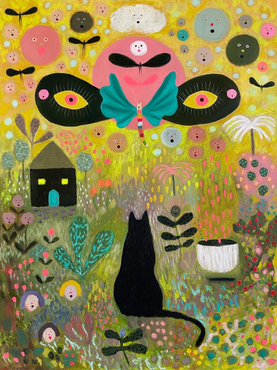 Sin seguir un proceso estricto, puede empezar en un lienzo colocado en un caballete o algo mucho mayor extendido en el suelo. “No sé cómo será el cuadro cuando lo acabe, no tengo una visión predeterminada, solo un tema general, una historia. A veces, la composición aparece rápidamente, todo encaja, pero lo habitual es que vuelva a pintar varias veces algunas zonas del cuadro hasta sentir que está bien”.