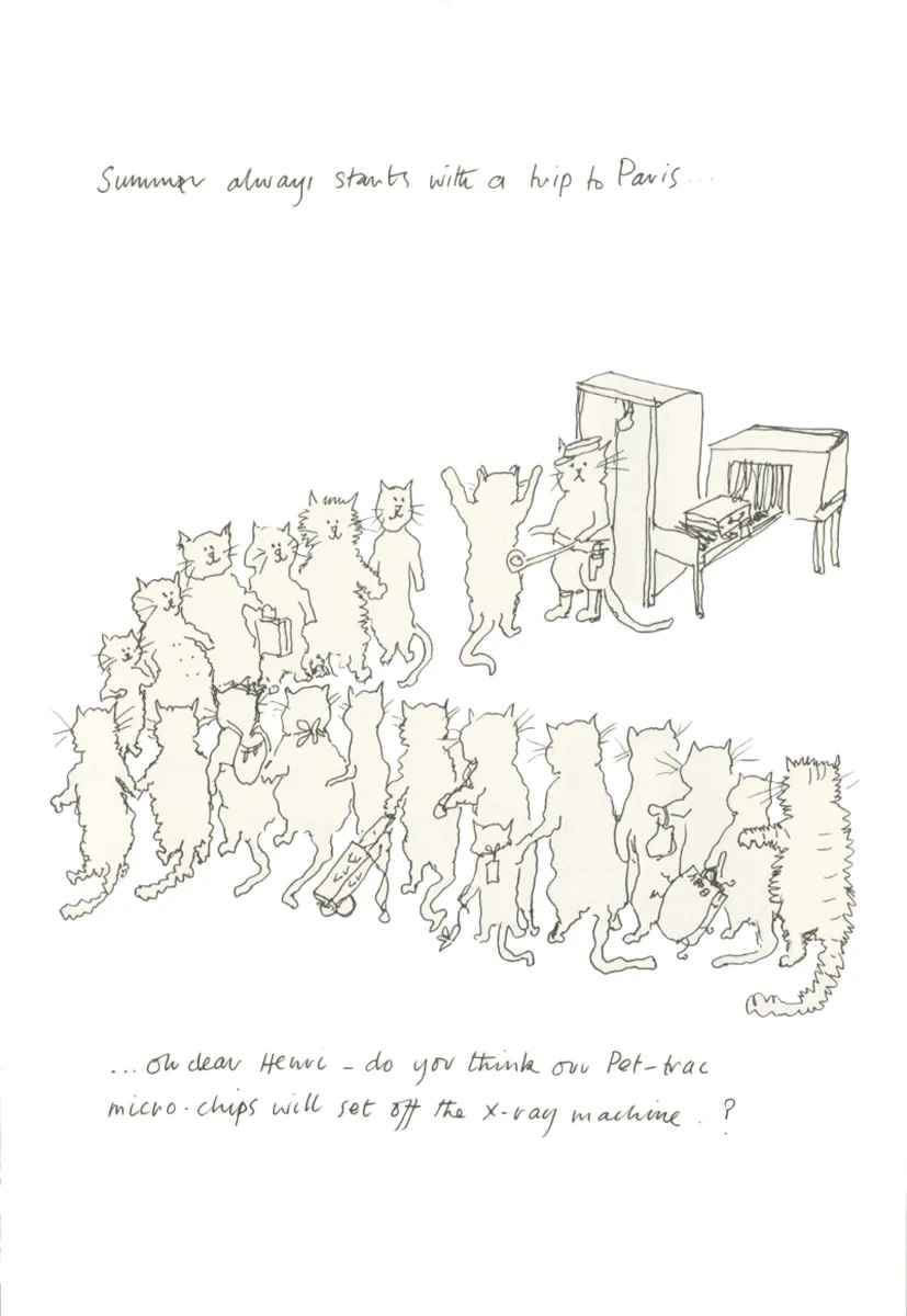 Uno de estos dibujos se realizó sobre papel de carta del hotel Four Seasons y dice así: “Nos fuimos de compras hasta… caer rendidos. Coco, ¿te parece políticamente correcto que un gato lleve un abrigo de piel? Ojalá no nos crucemos con alguien de PeTA (Personas por el tratamiento ético de animales)… No todas las tendencias de este otoño son muy ponibles… Los pantalones muy largos, por ejemplo, no facilitan los desplazamientos… Las hombreras exageradas no están hechas para cualquiera, tienden a empequeñecer… Ninguna gata de más de seis meses debería ponerse minifalda…”